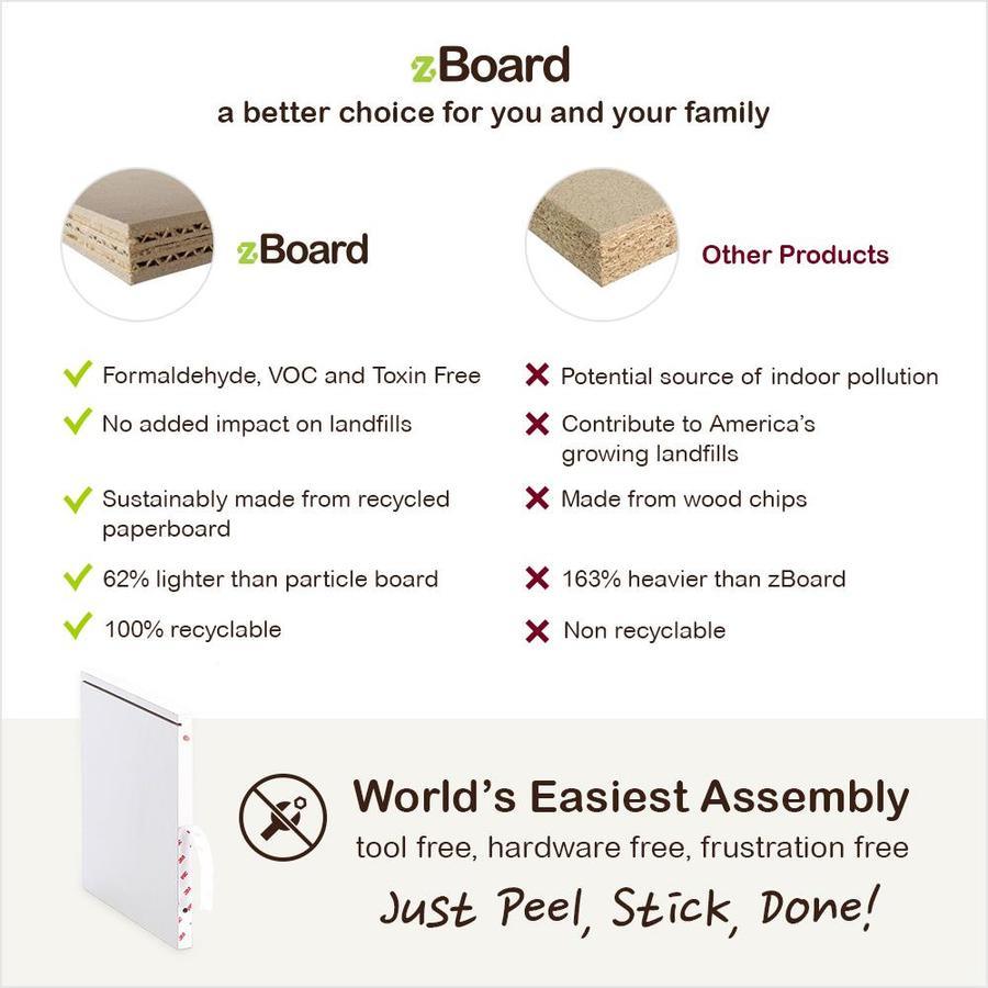 Lifetime guarantee; Happiness with product and service promised by our CEO and founder Made with eco-friendly and sustainable zBoard, non-toxic and free of formaldehyde and VOC Easy to assemble, no tools required, just peel the 3M industrial adhesive strips and put together with easy-align pins Maximum load 50 lbs (recommended) Made to stand upright, do not place on side or back