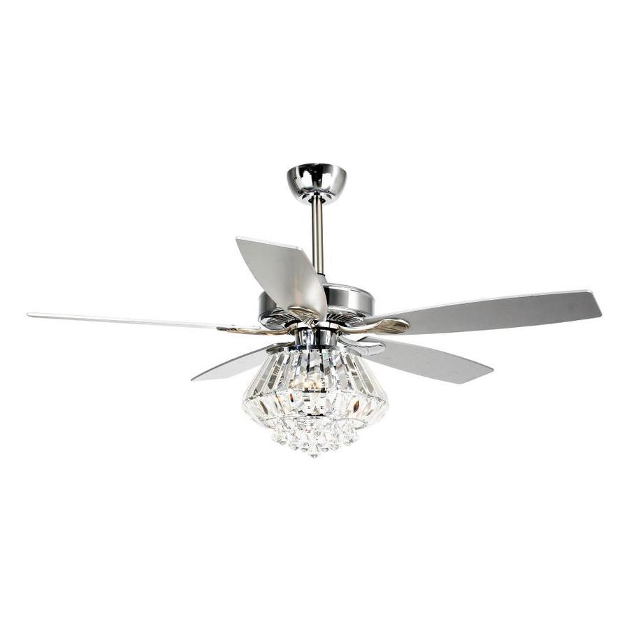 Chandelier ceiling fan- it is a combination of a unique modern crystal chandelier and a ceiling fan, ideal for a large room Reversible 5 chrome blades, manual setting reverse airflow feature allows you to change the fan's direction setting seasonally, so cool air is pushed down or warm air is distributed evenly 3 Speed setting make it easy to maintain the ideal comfort level Remote control included- this high-end remote control allows you to control the light and the fan speed separately and from anywhere in the room 52-In fan provides airflow up to 4800-CFM, making it ideal for large room Ceiling fan with lights, 40 watts LED bulbs ( not included) to provide ample illumination and trim your electric bill 4-In and 10-In L down rod included (can also be installed as max 15 degrees angle mount) Offering a limited lifetime motor warranty on all ceiling fans; with a 1-year warranty on all parts