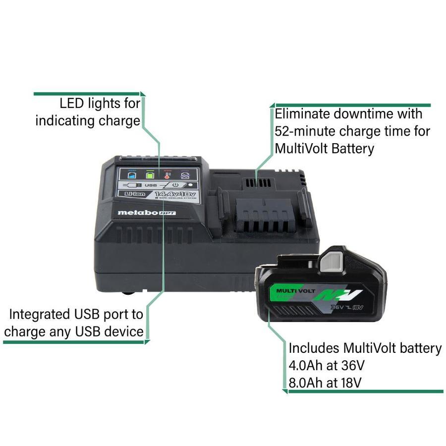 MULTIVOLT: Power source kit option for the MultiVolt power tool platform INCLUDES: A MultiVolt 36V battery (372121M) and rapid charger (U18isl3M) AMP HOURS: MultiVolt battery is 4.0 Ah when used in 36 V MultiVolt tools 18V TOOL AMP HOURS: MultiVolt battery is 8.0 Ah when used with Metabo HPT 18V Li-ion slide tools COMPATIBILITY: Battery can power Hitachi or Metabo HPT 18V slide type tools including cordless nailers generating 8.0Ah of run-time CHARGE TIME: MultiVolt battery charges in 52 minutes using the U18isl3M charger USB PORT: Charger has a built-in USB port that can charge USB enabled devices