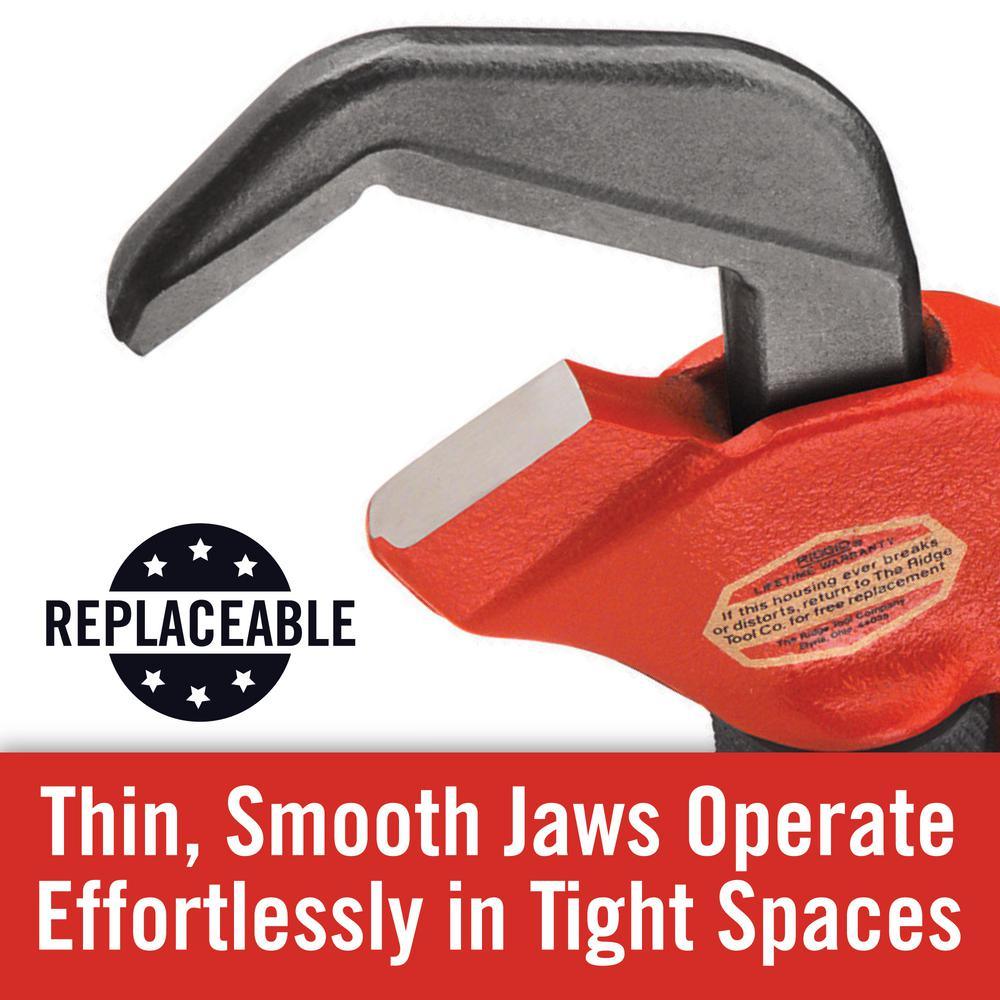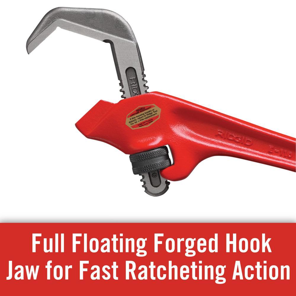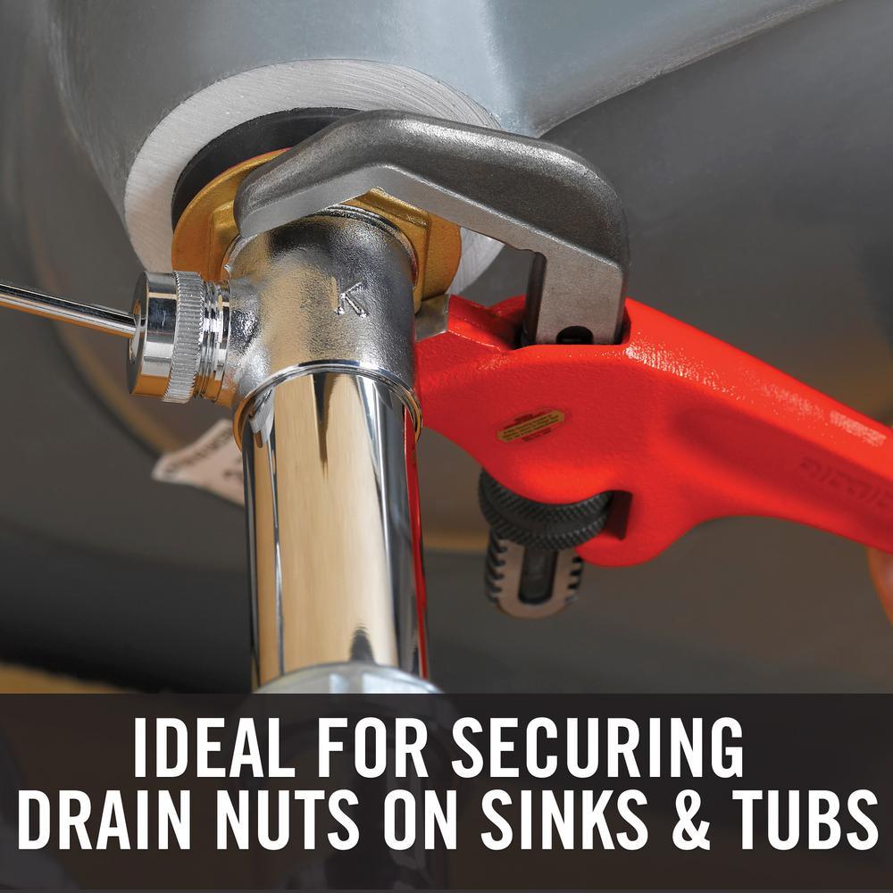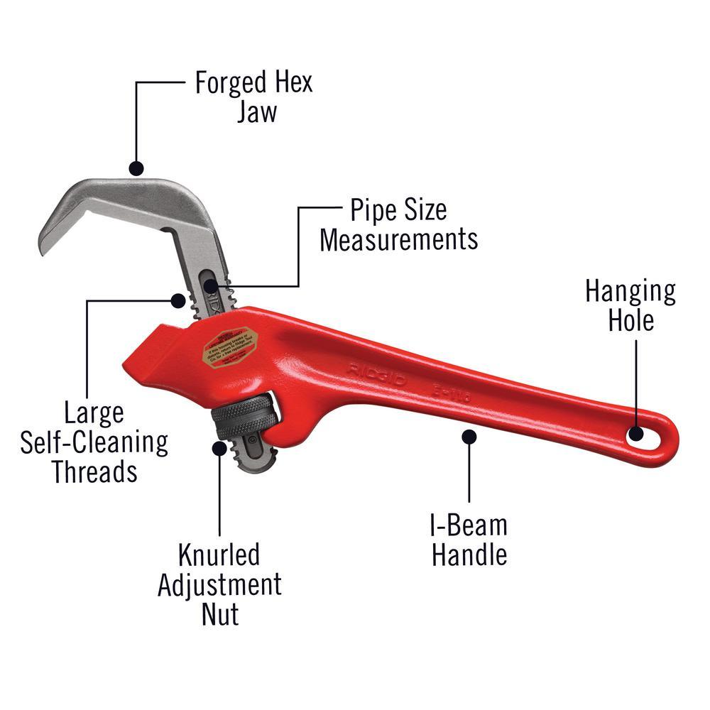 The RIDGID E-110 Hex Wrench, featuring an innovative jaw design, provides a multi-sided, secure grip on all hex nuts, square nuts, unions and valve packing nuts. Its offset design has an extra-wide opening that is ideal for securing drain nuts on sinks and tubs. The wide jaw also allows the hex pipe wrench to easily fit around pipes ranging from 1-1/8 in. to 2-5/8 in. The hex wrench has thin, smooth jaws that slip into tight spaces for on-the-job convenience.
