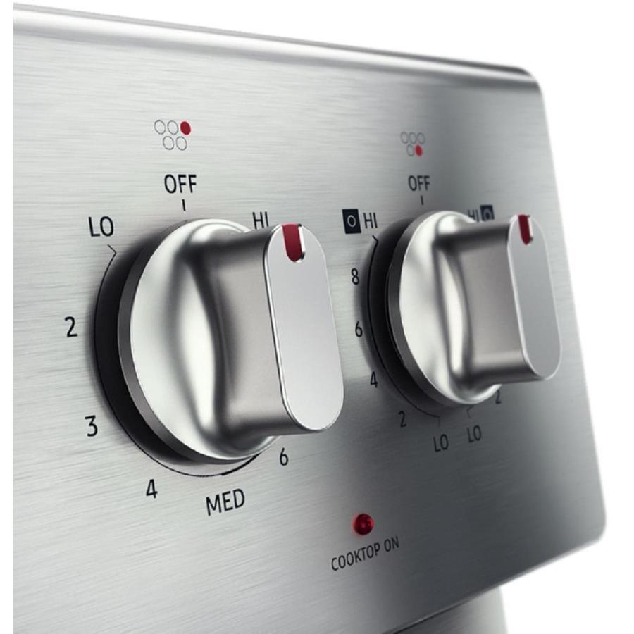 5.9 cu ft Large Capacity: Power cook your way through the week with a 5.9 cu ft capacity oven Convection: Bake in Bulk; convection cooking circulates air for faster more even cooking Powerful, Flexible Cooktop: Accommodates multiple pan and pot sizes, on five specialized cooking elements Dual Ring Elements (6-in/9-in and 9-in/12-in) offer flexibility to cook with various pans Steam and Self Clean: Use steam clean for a quick clean in 20 minutes or Self Clean for a deeper clean Hidden Bake: A Hidden Bake Element makes cleaning your oven easy with seamless interior Storage Drawer: The storage drawer is ideal for storing baking sheets and pans while saving space in kitchen cabinets Stainless Steel Cooktop - Premium look and larger cooking surface for greater flexibility to use multiple pot and pan sizes
