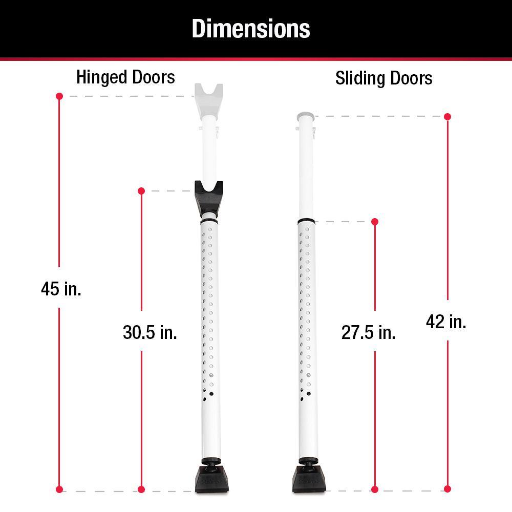 • Door jammer adjusts from 27.5 in. (70 cm) to 42 in. (1.1 m) for application flexibility; Top piece is easily removed for use as a sliding door security bar