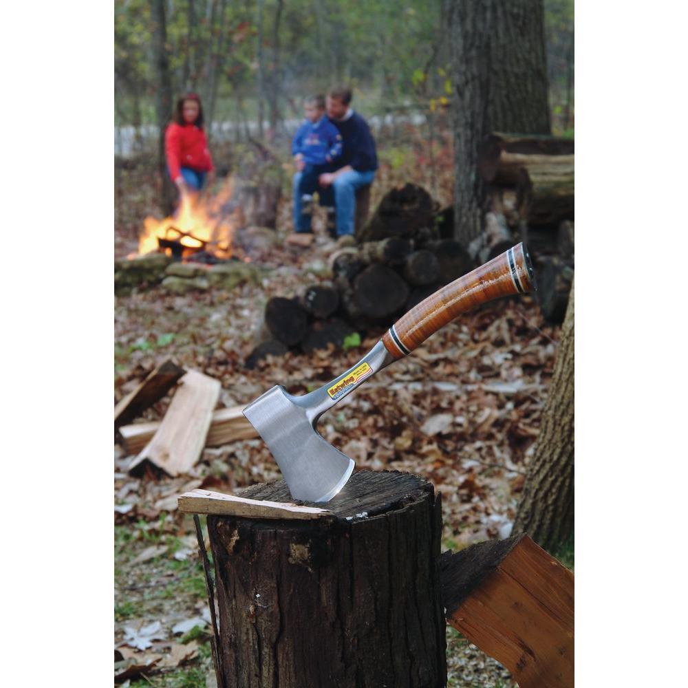 When you're hitting the great outdoors, make sure to bring the Estwing's 14 in. sportsman's axe. It is ideal for campers and outdoorsman. It features a head and handle of the axe are forged in 1-piece and are fully polished. This classic axe offers unsurpassed balance an attractive sheath. It has a tempered thin 3-1/4 in. cutting edge for easy cutting. It has a genuine leather grip that is sanded and lacquered for a beautiful finish. Always make sure to wear safety goggles to protect your eyes when in use.