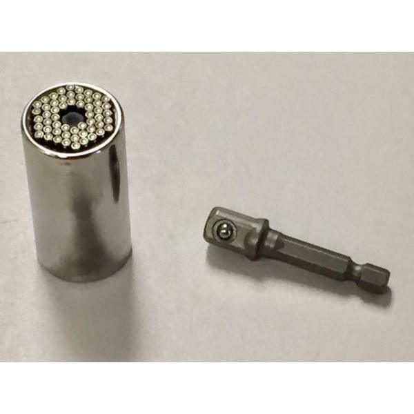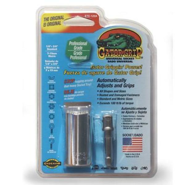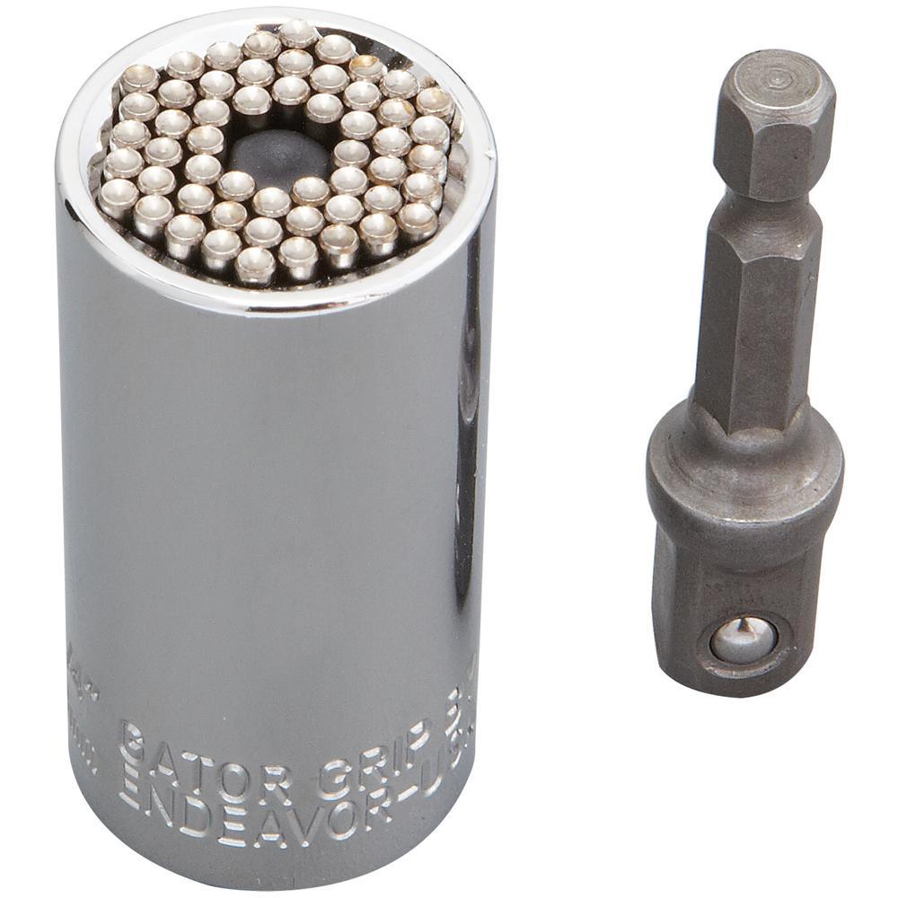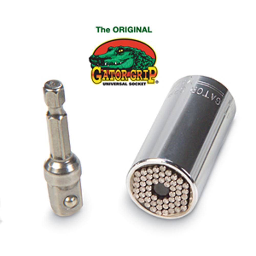 The Gator Grip Universal Socket with Power Drill Adapter fits nut and bolt heads from 1/4 in. to 3/4 in. standard and 7 mm to 19 mm metric. Easy to use just press on fastener and turn. Especially good to remove rusted and damaged fasteners. Use the drill adapter to transform an electric drill into a power socket set.