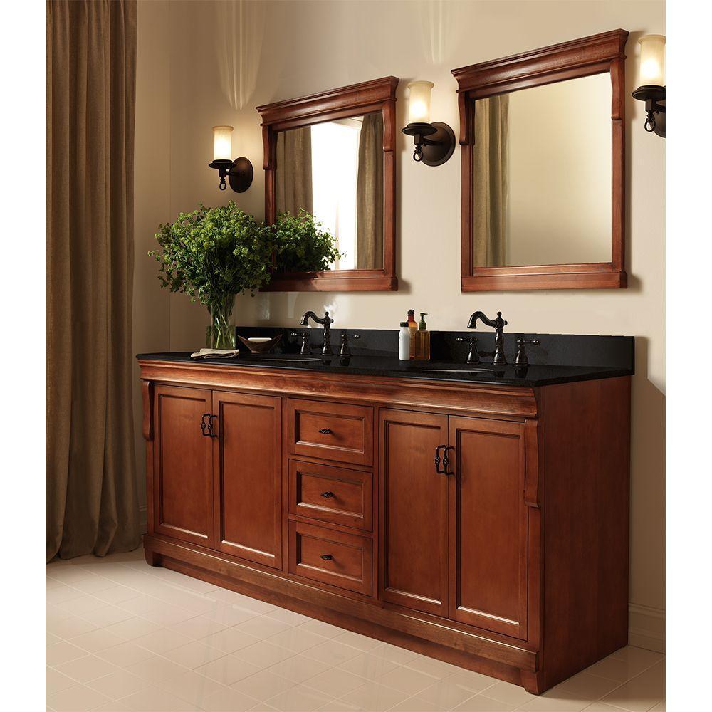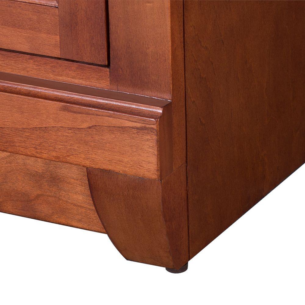 Awash with a warm cinnamon finish, this 60-in. double vanity is full-bodied and sits flush with the floor. It is an attractive, elegant piece with an upscale look. Two sets of double doors, one right and one left, and three middle drawers are equipped with black birdcage-style handles that produce a vintage appearance. The vanity's solid, seamless construction gives homeowners and contractors the sense that it is custom-built, while the generous storage space within accepts bathroom accessories aplenty. Cap this furniture-style bathroom vanity with a top-sink-faucet combination that ties the room together. Browse the Foremost Naples lineup for mirrors and wall-linen cabinets in the same cinnamon finish for a complete look.