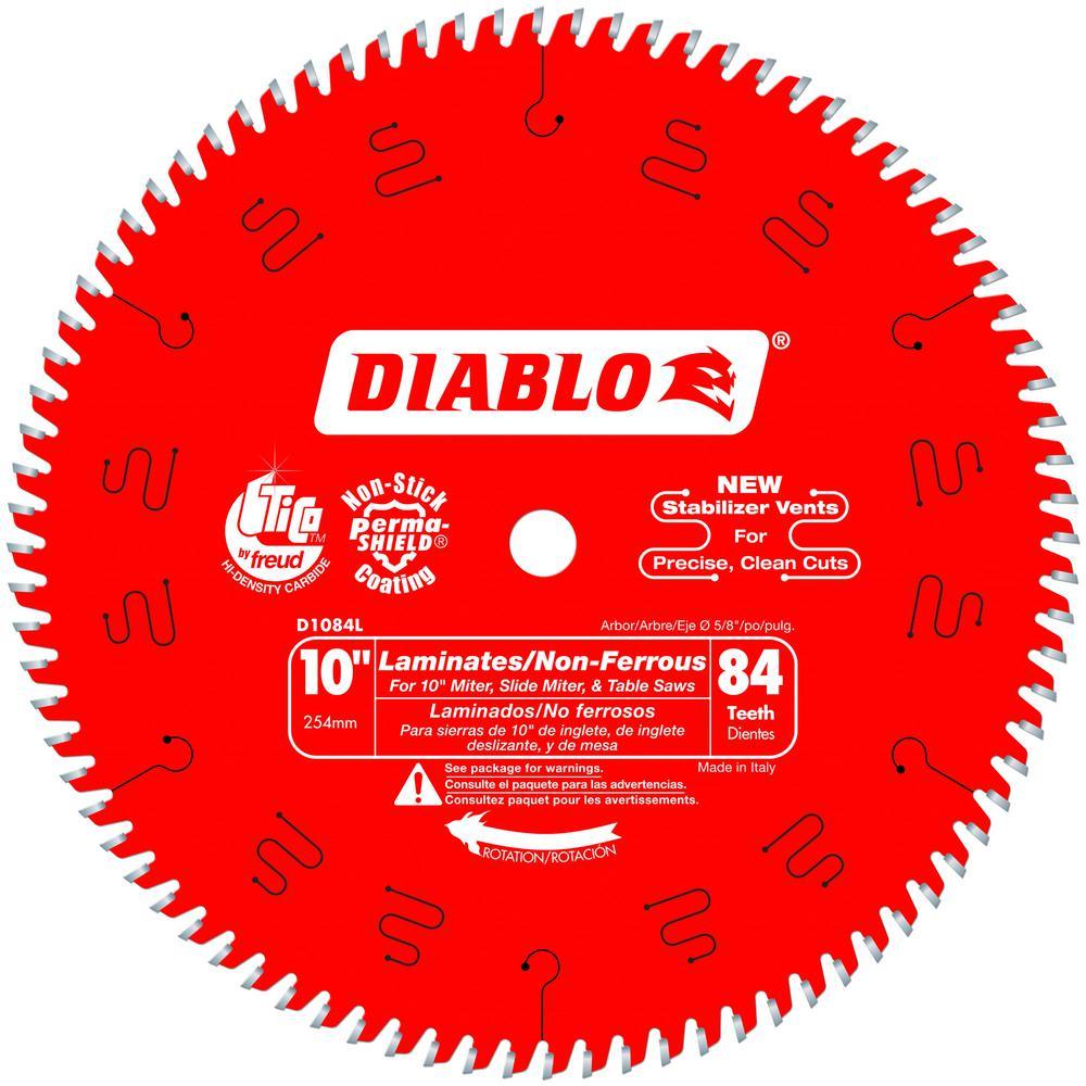 Diablo's next generation 10 in. x 84 Tooth Non-Ferrous Carbide Circular Saw Blade features new laser-cut stabilizer vents for precise and clean cuts in laminates and non-ferrous materials. The advanced stabilizer vents feature a permanent filler baked in from top to bottom for absorbing noise and preventing sideways movement, allowing the blade to slice through laminates and non-ferrous metals cleanly, quickly and accurately. Constructed with TiCo Hi-Density special-blend carbide, Diablo's 10 in. non-ferrous blade produces precise cuts and provides 5X longer cutting life. The laser cut heat expansion slots allow the blade to expand and contract during use, keeping the cut true and straight. This blade is excellent for cutting laminate flooring, plastics, brass, aluminum, copper and fiberglass.