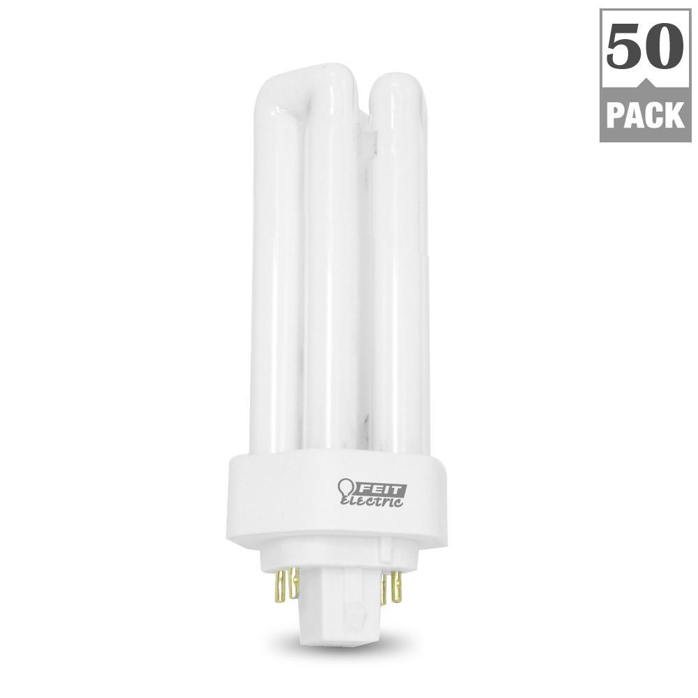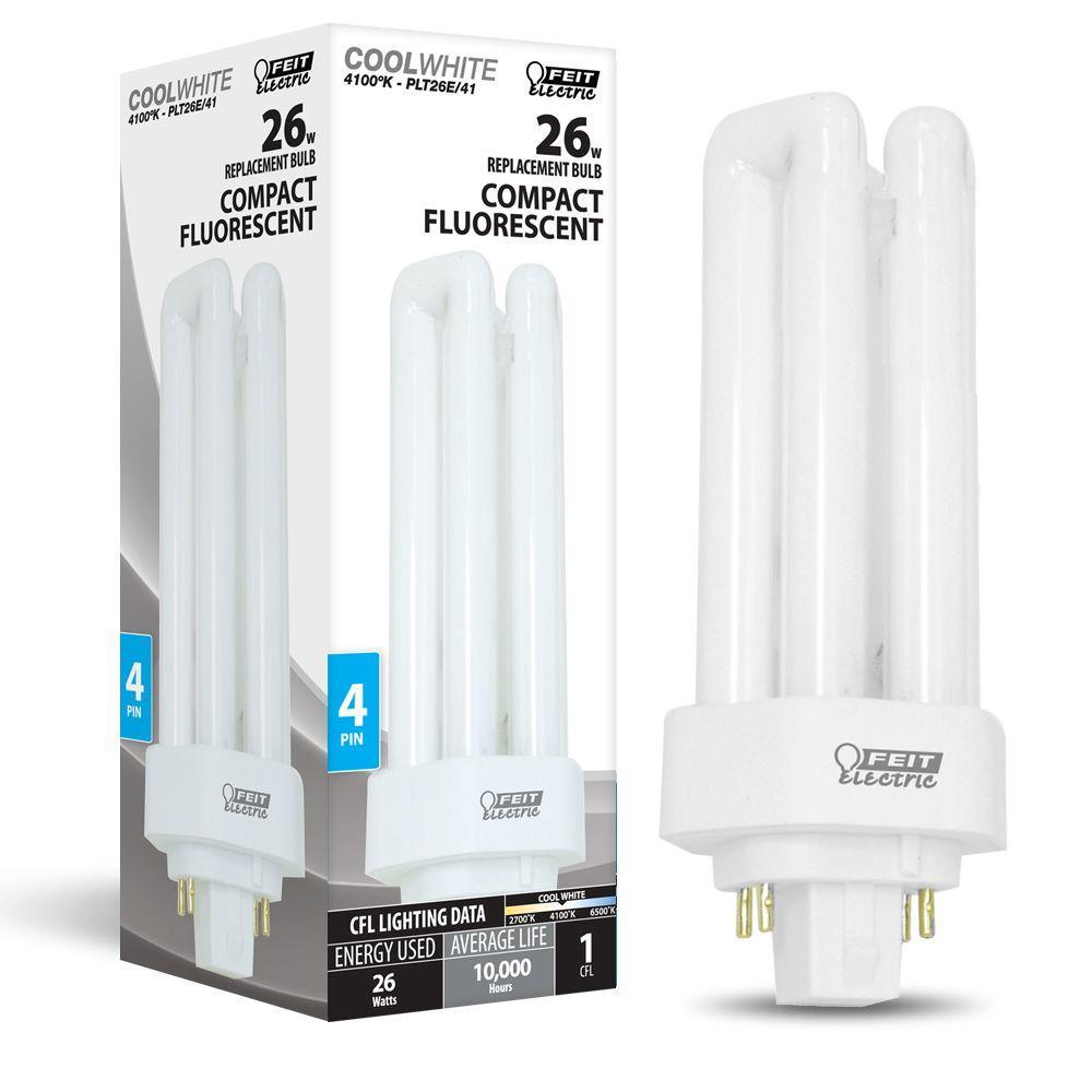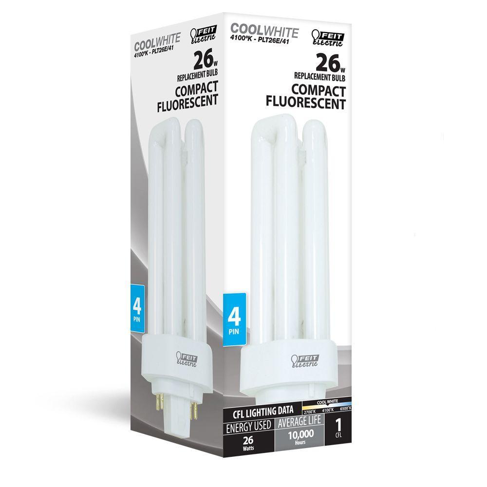 The Feit Electric 26W Equivalent Cool White (4100K) Non-Integrated CFL Light Bulb is a 50 pack of 26-Watt Light Bulbs. These compact fluorescent lamps have a 4-pin base and PL shape. They have a color temperature of 4100K for a cool white light.