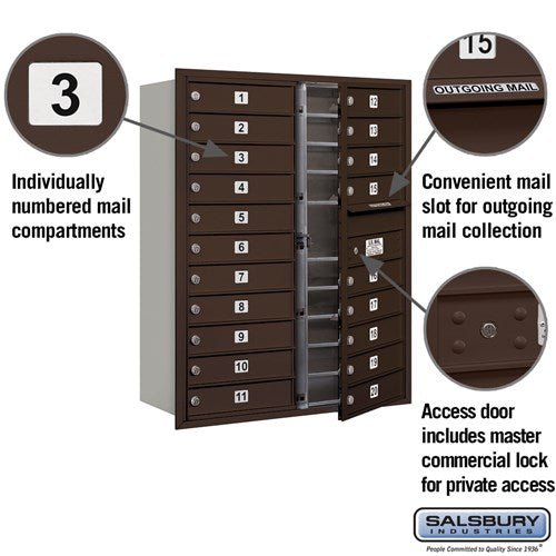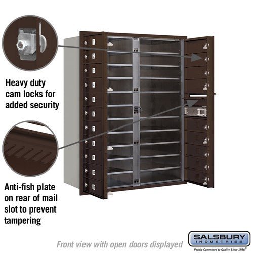 This recessed mounted 4C horizontal mailbox features 20 doors and a durable bronze finish, ideal for private access in various settings. Constructed with heavy-duty aluminum and stainless steel hardware, it ensures security and longevity.