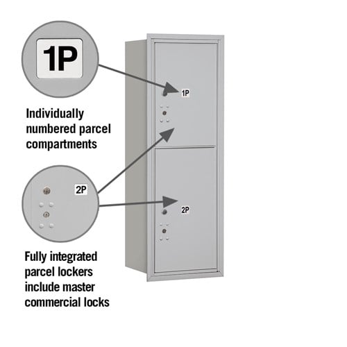 This recessed-mounted parcel locker features 11 doors and 2 parcel lockers, designed for private access and rear loading. Constructed with heavy-duty aluminum and stainless steel hardware, it offers durability and security for indoor or outdoor use.