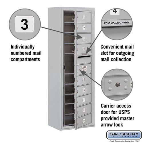 This 11-door surface-mounted mailbox is designed for secure mail storage and distribution, featuring heavy-duty aluminum construction and a durable powder-coated finish. Ideal for indoor and outdoor use, it includes a USPS-approved outgoing mail compartment and ADA compliance.