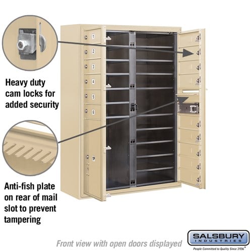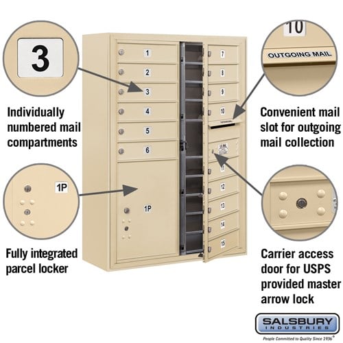 This 11 Door High Surface Mounted 4C Horizontal Mailbox is designed for USPS access and features a durable sandstone finish. Ideal for apartments and commercial buildings, it includes a parcel locker and is ADA compliant.