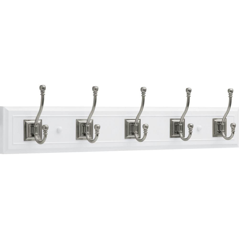 • Bright white rack with elegant satin nickel hooks adds style and class