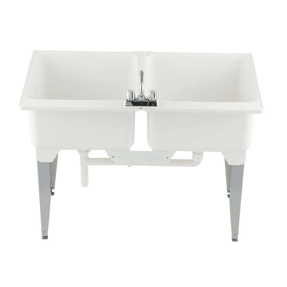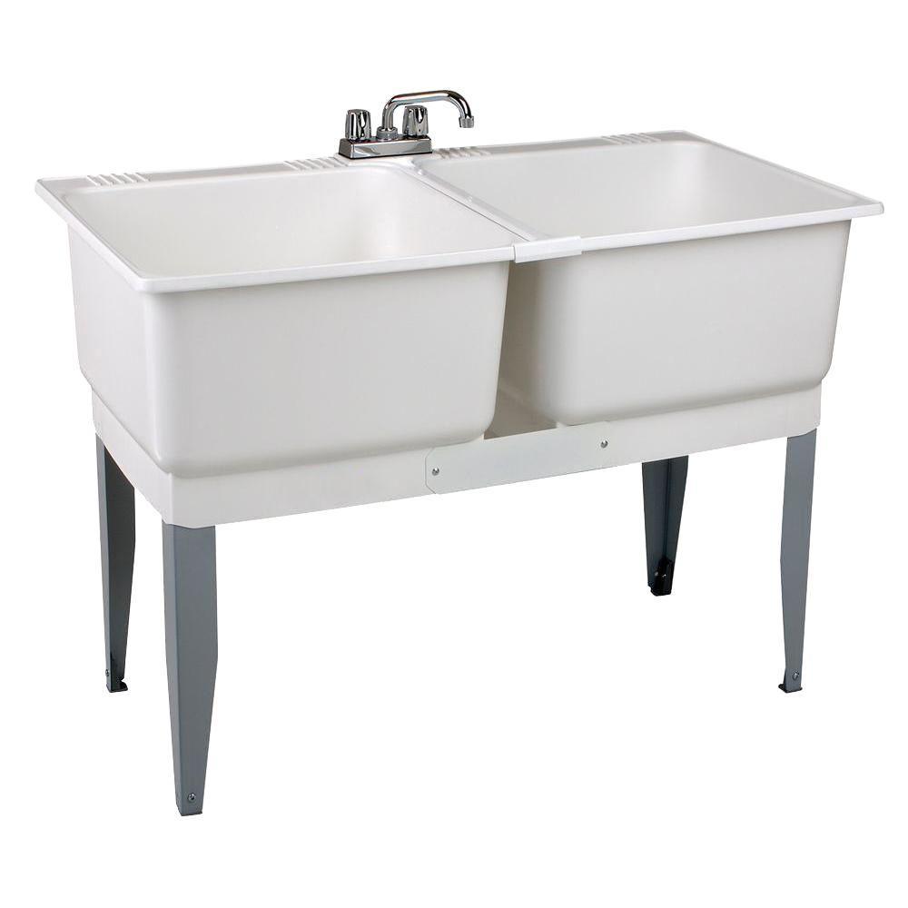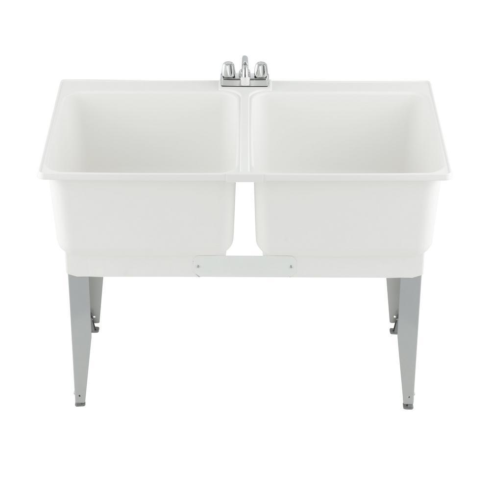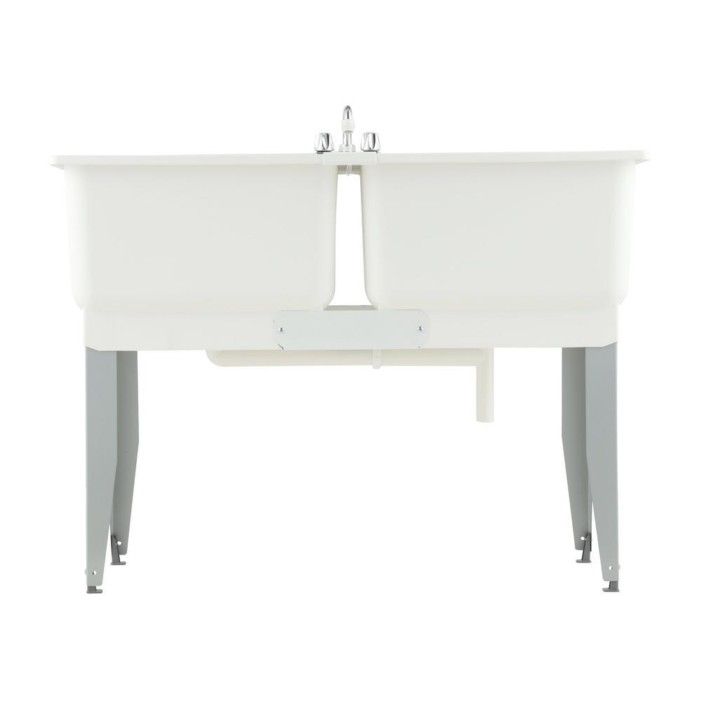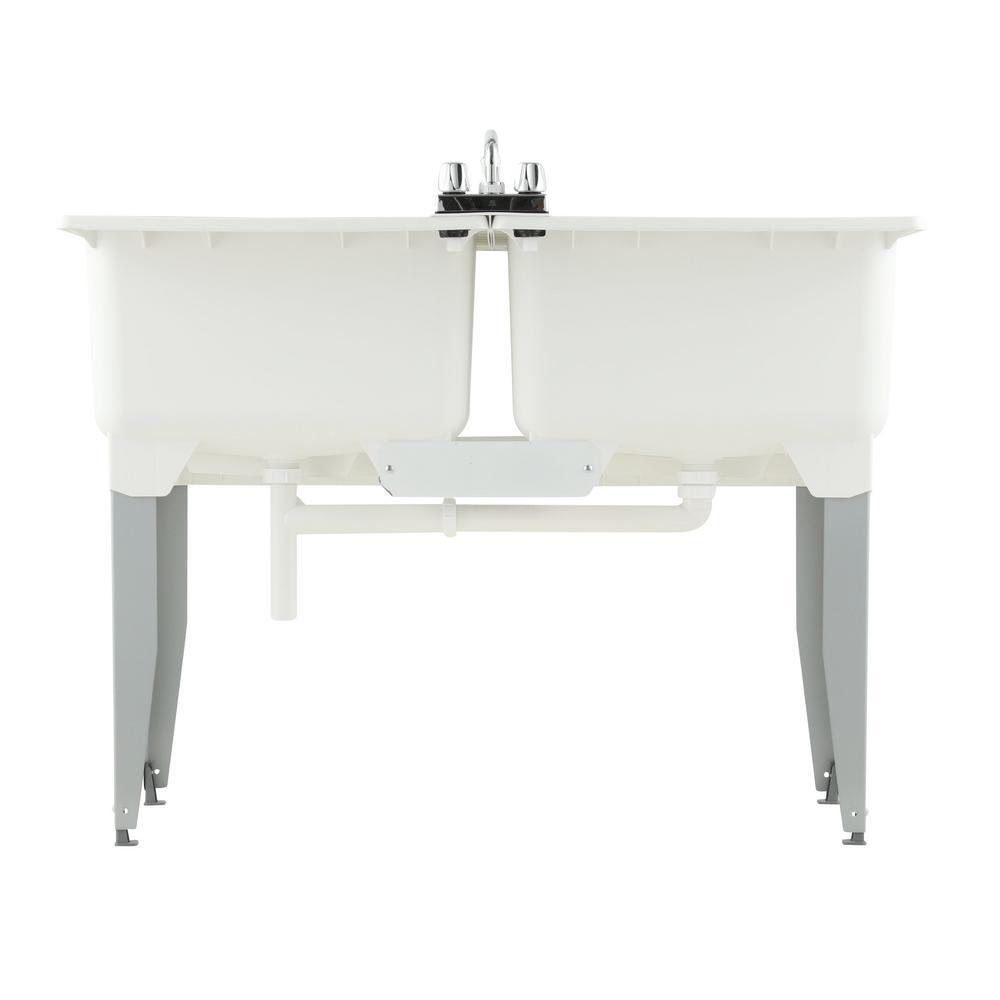 The MUSTEE 46 in. x 34 in. Plastic Laundry Tub features heavy gauge steel legs with adjustable levelers for sturdy use. Each tub basin has a 20 Gal. capacity and is leak proof for added convenience. The basins also have integrated drains and mildew-resistant surfaces that you can easily clean.