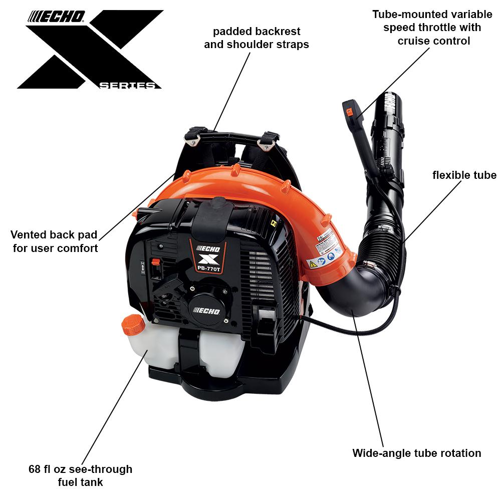 The X Series ECHO PB-770T gas leaf blower makes yard cleanups easy and comfortable. The yard blower’s throttle is conveniently tube mounted and features a cruise control function, and the variable speeds allow you to adjust air speeds to fit your cleaning needs. The backpack lawn blower features padded shoulder straps and a ventilated back pad for comfortable use.