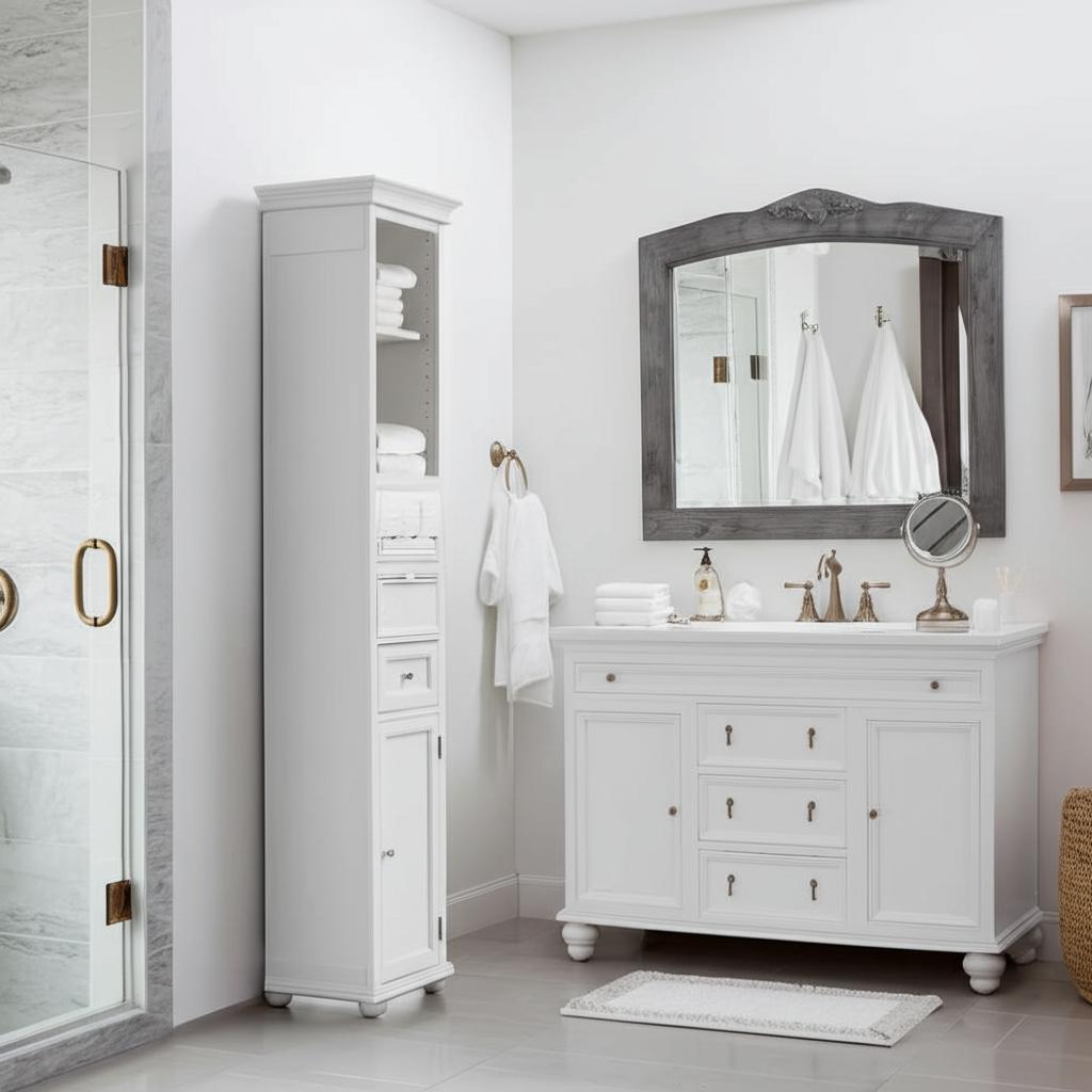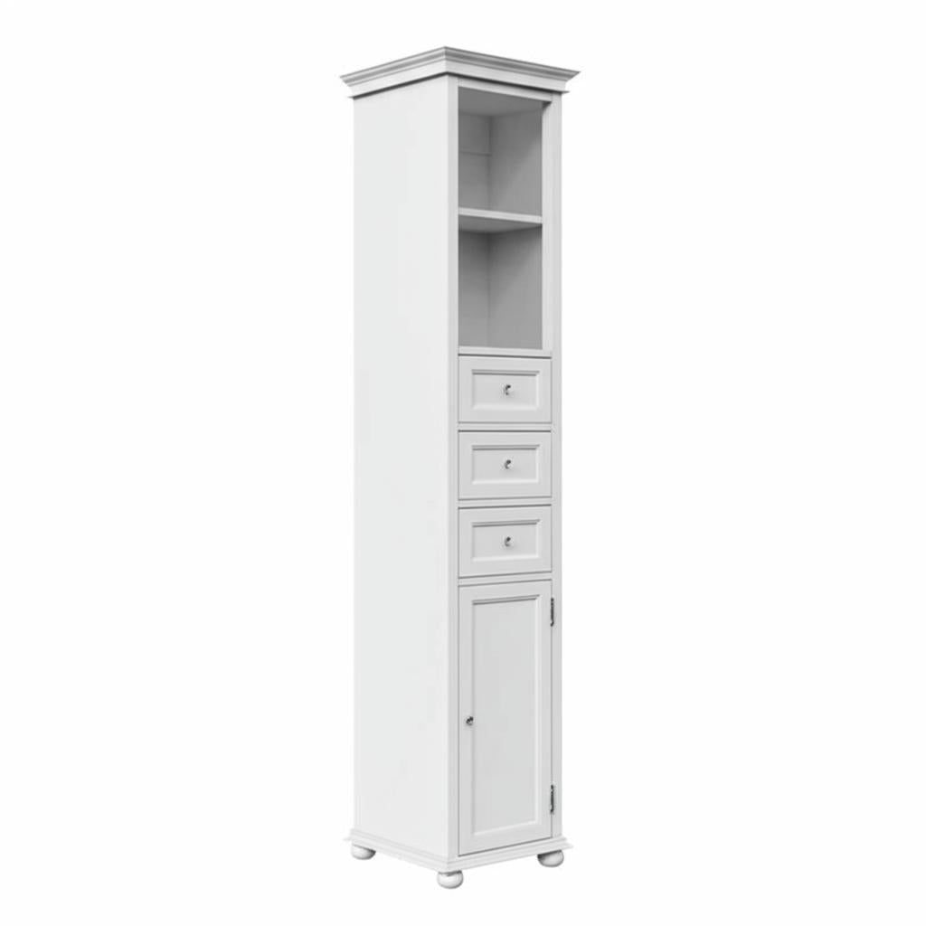 The Hampton Harbor Linen Cabinet by Hampton Bay combines elegant design with practical storage. Featuring a white finish, crown molding, and bun feet, this cabinet offers a stylish solution for organizing your space. With adjustable shelves and drawers, it provides ample storage for your essentials.
