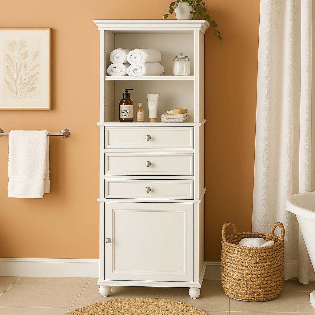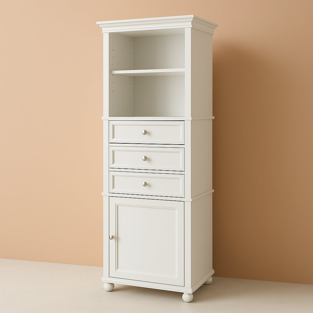 The Hampton Harbor Corner Linen Cabinet combines elegant design with practical storage solutions. Featuring adjustable shelves, drawers, and a panel door, it offers ample space for linens and accessories. Its white finish and decorative details make it a stylish addition to any room.