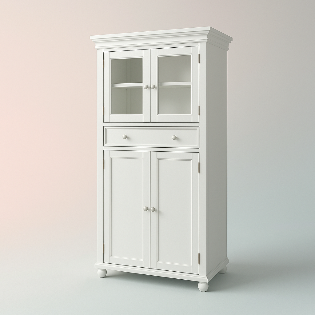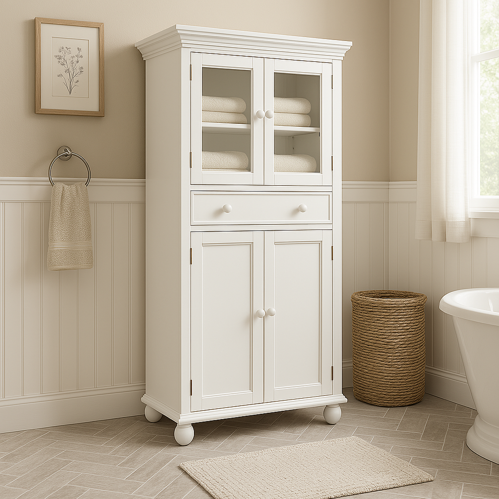 The Hampton Harbor Linen Cabinet combines elegant design with practical storage solutions. Featuring recessed-panel doors, tempered glass panels, and chrome-finished hardware, this cabinet is perfect for organizing linens and bath accessories. Its durable construction and versatile white finish make it a stylish addition to any bathroom.
