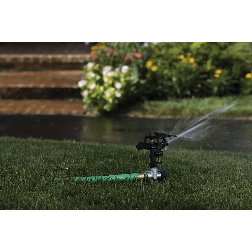 This dual pack of durable poly pulsating sprinklers is perfect for watering a large area. Connect the units in series to spray a gentle rain of water over your lawn or garden. Adjust the flow or angle to fit your watering needs. The sturdy metal spikes are easy to place even in hard soil.