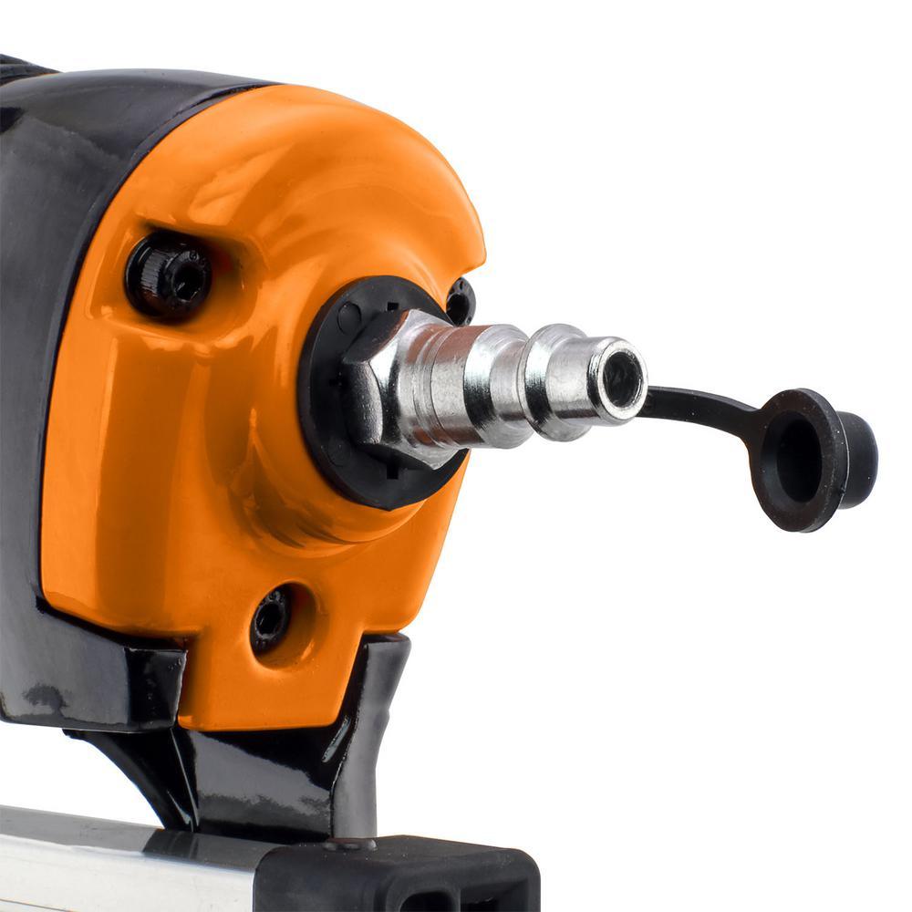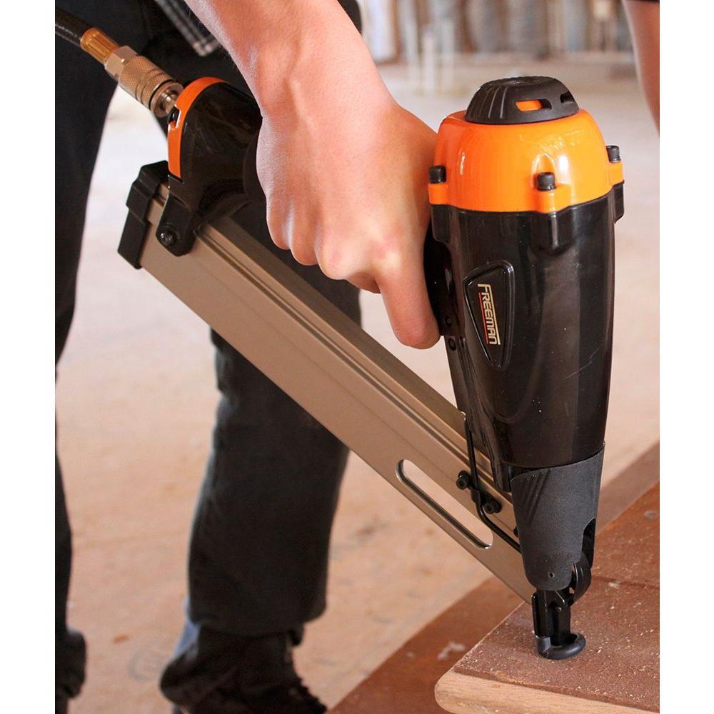 Top off your projects with Freeman PFN1564 Pneumatic 15-Gauge 34° Angle 2-1/2 in. Finish Nailer with Case. Use it to install door and window casing, moulding, trim, chair rails, cabinetry and other fine finish applications. This air powered nail gun is compatible with 15-Gauge tape or glue collated 34° finish nails from 1-1/4 in. to 2-1/2 in. Convenient and time saving features include a tool-free quick jam release nose for fast and easy nail extraction should a nail jam during use, a dual mode trigger for switching between sequential or bump firing, and a comfort grip handle to reduce fatigue and increase control. The depth of the nails is easily adjustable for various applications by simply turning a wheel near the trigger. The 34° angle of the magazine allows the user to reach into corners or tight spaces with ease. This durable finish nailer is a must-have for DIYers taking on home improvement and repair projects, as well as professional construction contractors at the job site. The Pneumatic 15-Gauge 34° Angle 2-1/2 in. Finish Nailer includes a blow molded carry case, belt hook, safety goggles, air tool oil, and adjustment tools, and is covered by Freeman's 7-Year Limited Warranty and 90-day Wearable Parts Warranty.