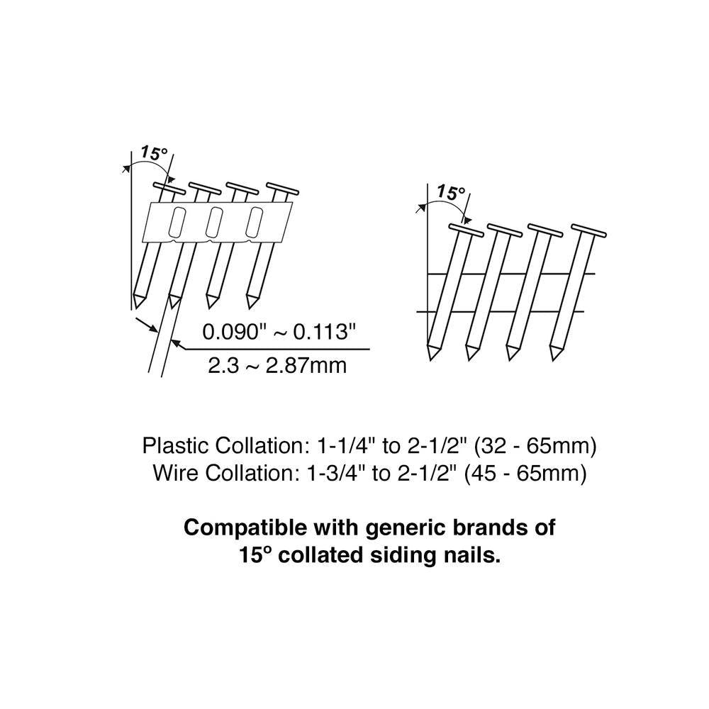 Compatible with 15 degree plastic collated coil siding nails from 1-1/4 in. to 2-1/2 in., and 15 degree wire collated coil siding nails from 1-3/4 in. to 2-1/2 in. (diameter 0.09 in. to 0.113 in.)