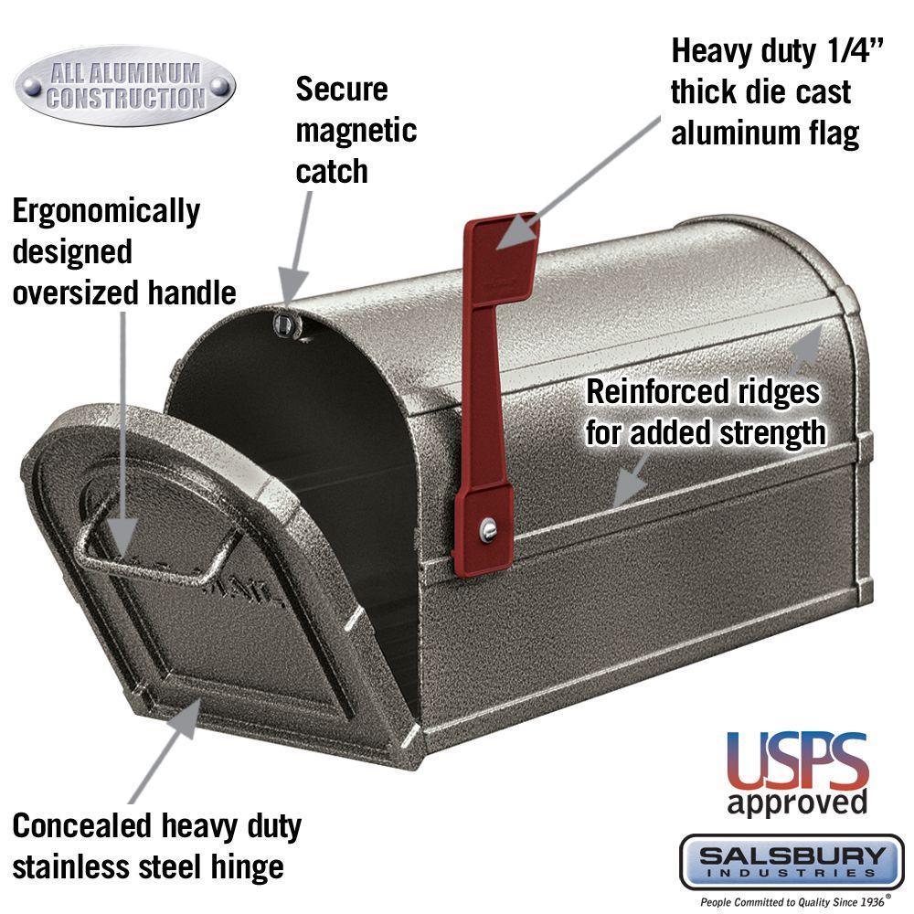 Featuring durable aluminum construction, the Salsbury Industries 4800 Series Post-Mount Deluxe Rural Mailbox has a secure magnetic catch and reinforced ridges for added strength. This mailbox has a generous size to accommodate letters, magazines and packages and is approved by the Postmaster General. This mailbox is rust- and impact resistant and comes pre-assembled for easy installation.