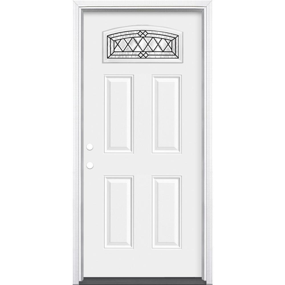 Experience the durability of steel and the beauty of decorative glass with the Masonite Halifax Camber Fanlite Left Hand Inswing Primed Steel Prehung Front Exterior Door with Brickmold. The glass insert adds value and sophistication to your home while maintaining privacy and security. With high-definition panels, this door replicates the look of a high-end wood door and features a smooth, baked-on primer for a long-lasting finish. The triple pane tempered glass assembly and high-quality steel provide added strength, while the antique black caming and white primed surface allow for customization. The reinforced lock area ensures stability and the door comes fully assembled with hinges, frame, aluminum sill, and weather stripping. The double bored exterior door slab is ready for a lockset (sold separately) and opens towards the inside of the home, with hinges on the left.