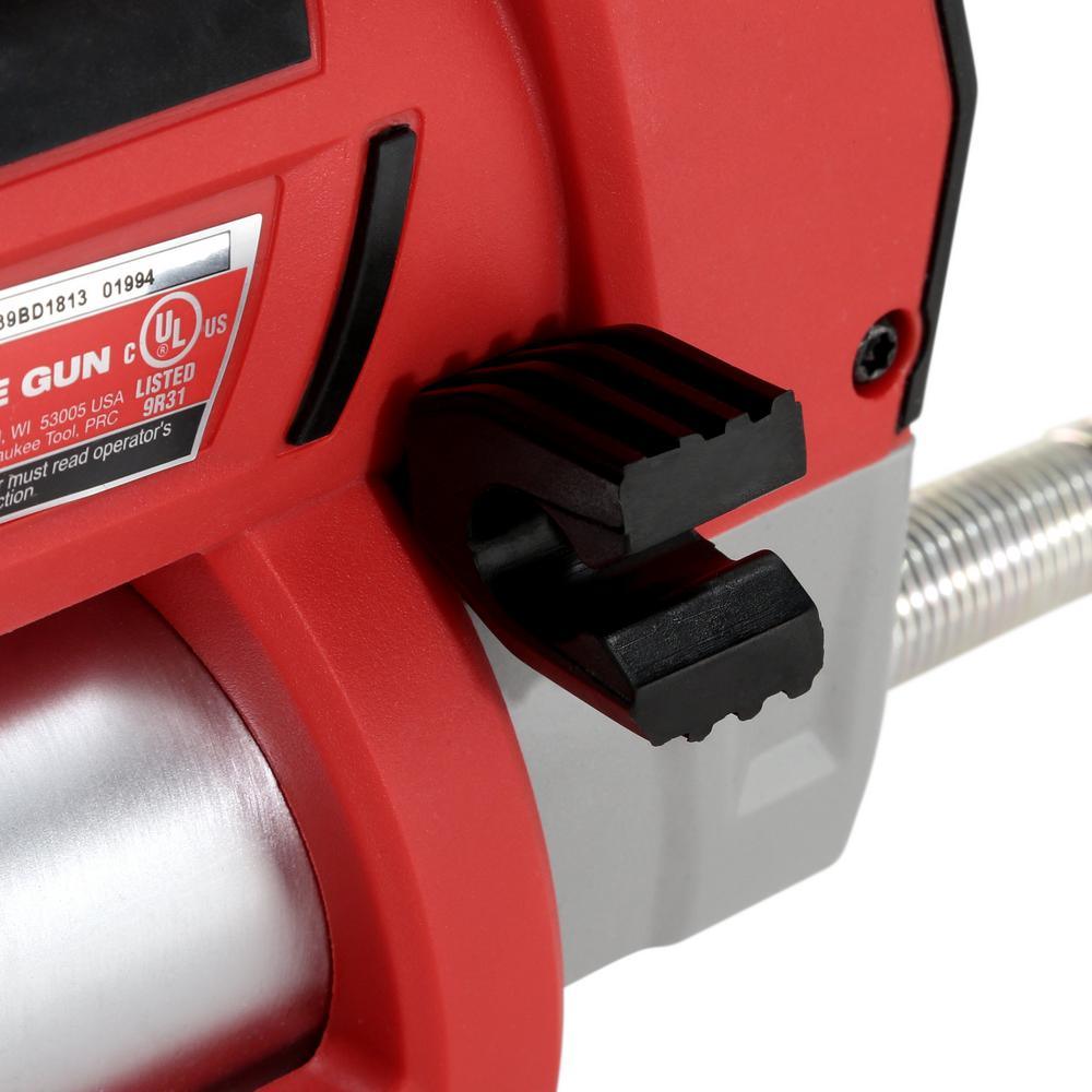 The MILWAUKEE M12 Cordless Grease Gun Kit delivers the highest max operating pressure in its class to help users handle heavy-duty applications and eliminate downtime. The M12 REDLITHIUM battery lets users dispense up to seven grease cartridges per charge, providing up to 25% more pressure and more than 8,000 PSI operating pressure for heavy machinery, cold weather applications and clogged grease fittings. The cordless grease gun has a lightweight, ergonomic handle that offers users greater comfort during prolonged use and an onboard hose storage and shoulder strap for convenience with less mess. This kit comes with one 12-volt extended capacity battery, a 60-minute charger, 36 in. flex hose with spring guard, grease coupler and carrying case.