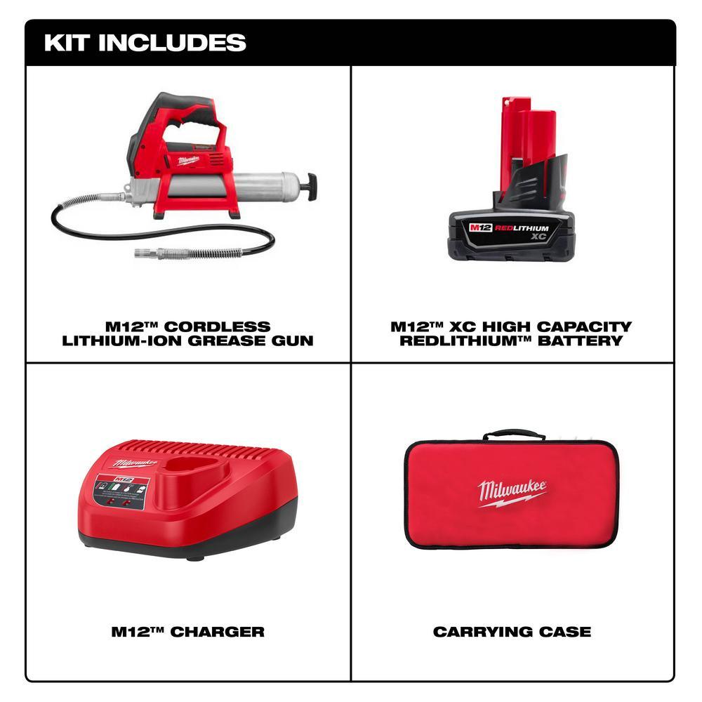 - Includes: (1) M12 cordless Lithium-Ion grease gun (tool only), (2446-20)(1) M12 Lithium-Ion battery charger (48-59-2401), (1) M12 XC high capacity REDLITHIUM battery (48-11-2402), (1) carrying case