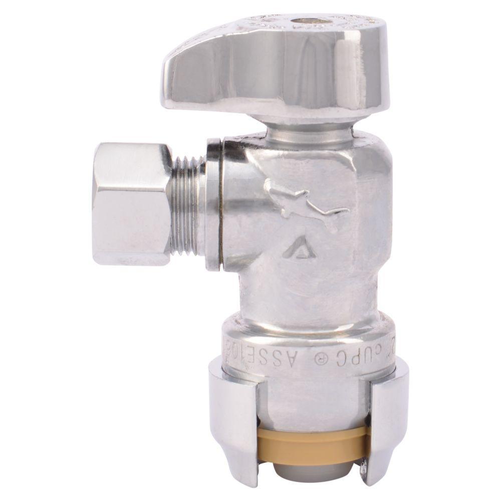The SharkBite 1/2 in. Push-to-Connect x 3/8 in. O.D. Compression Angle Stop Quarter-Turn Angle Valve controls water flow to household plumbing fixtures. The Angle Stop Valve is used where the water pipe enters the room to allow for easy shut-off of water flow to the end fixture allowing for maintenance and repair without having to turn water off to the entire home. The SharkBite push-fit end allows you to simply push on to Copper, CPVC or PEX with no solder, clamps, unions or glue. Just insert the pipe and the stainless steel teeth bite down and grip tight, while a specially formulated O-ring compresses to create a perfect seal. Dis-assembly is just as fast using the simple disconnect tool so fittings and valves can be easily changed and reused. They can even be rotated after assembly for easier installation in tight spaces.