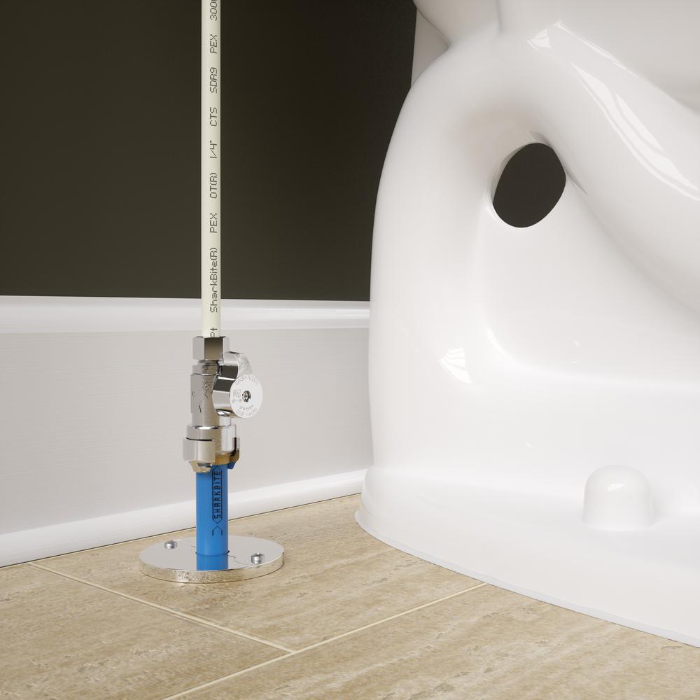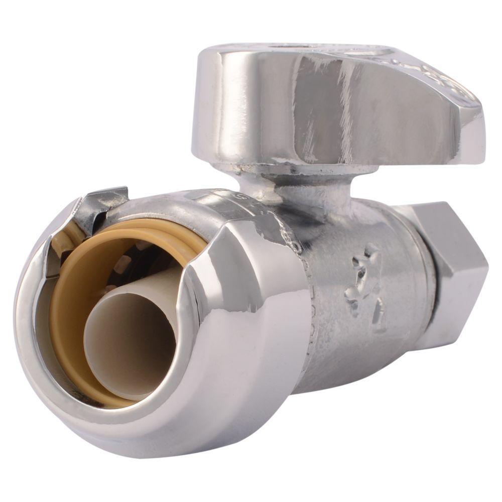 The SharkBite 1/2 in. Push-to-Connect x 3/8 in. O.D. Compression Quarter-Turn Straight Stop Valve controls water flow to household plumbing fixtures. The Straight Stop Valve is used where the water pipe enters the room to allow for easy shut-off of water flow to the end fixture allowing for maintenance and repair without having to turn water off to the entire home. The SharkBite push-fit end allows you to simply push on to Copper, CPVC or PEX with no solder, clamps, unions or glue. Just insert the pipe and the stainless-steel teeth bite down and grip tight, while a specially formulated O-ring compresses to create a perfect seal. Disassembly is just as fast using the simple disconnect tool so fittings and valves can be easily changed and reused. They can even be rotated after assembly for easier installation in tight spaces.