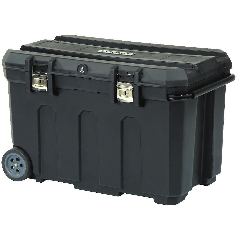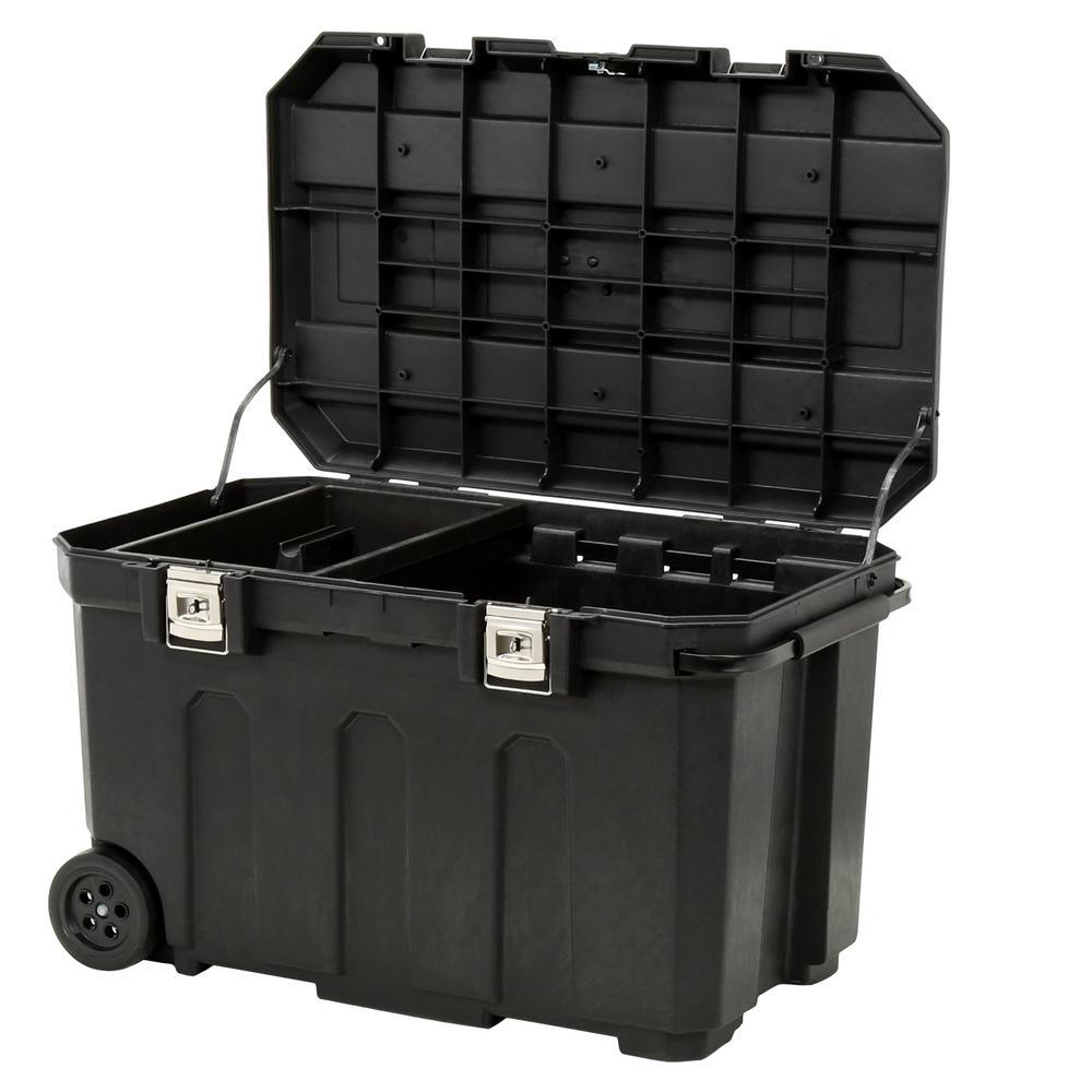 50 Gal. capacity, suitable for large power tools and accessories. Large, heavy-duty metal latches with pad lock eyes. Unique tote tray sits conveniently on the pull-out steel handle, increasing the available work space.