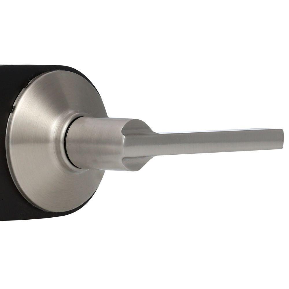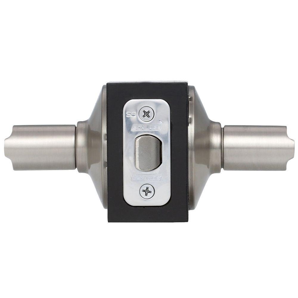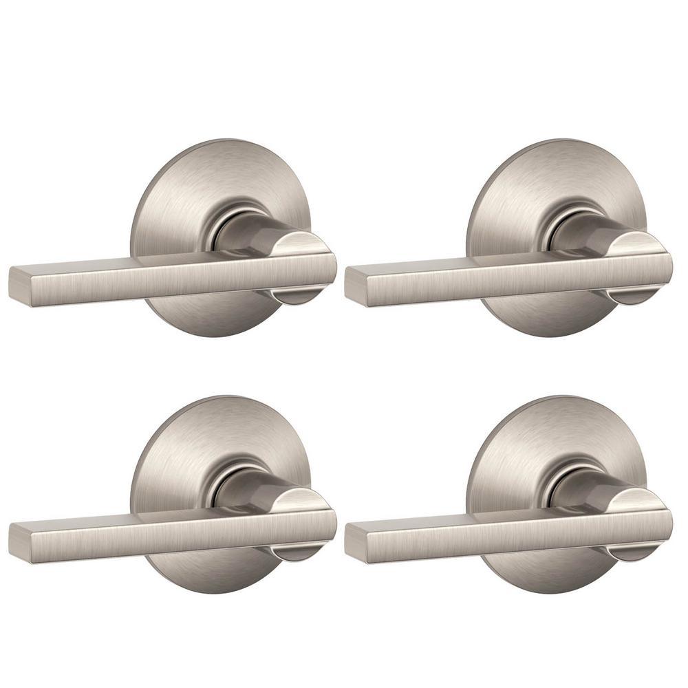 Add a crisp element to your interior with this Schlage passage door lever (4-Pack). It is ideal for hallway and closet doors where a locking function isn’t necessary. Featuring clean lines and rectangular structure, this lever of solid brass and a versatile satin nickel finish pairs well with contemporary and urban decors. Its universal design works with right and left swing doors with a 1-3/8 in. to 1-3/4 in. thickness. Installation with a Phillips screwdriver takes minutes, and this door lever features self-aligning screw holes for a hassle-free setup. The universal latch slides into place without the need for tools or manual adjustments.