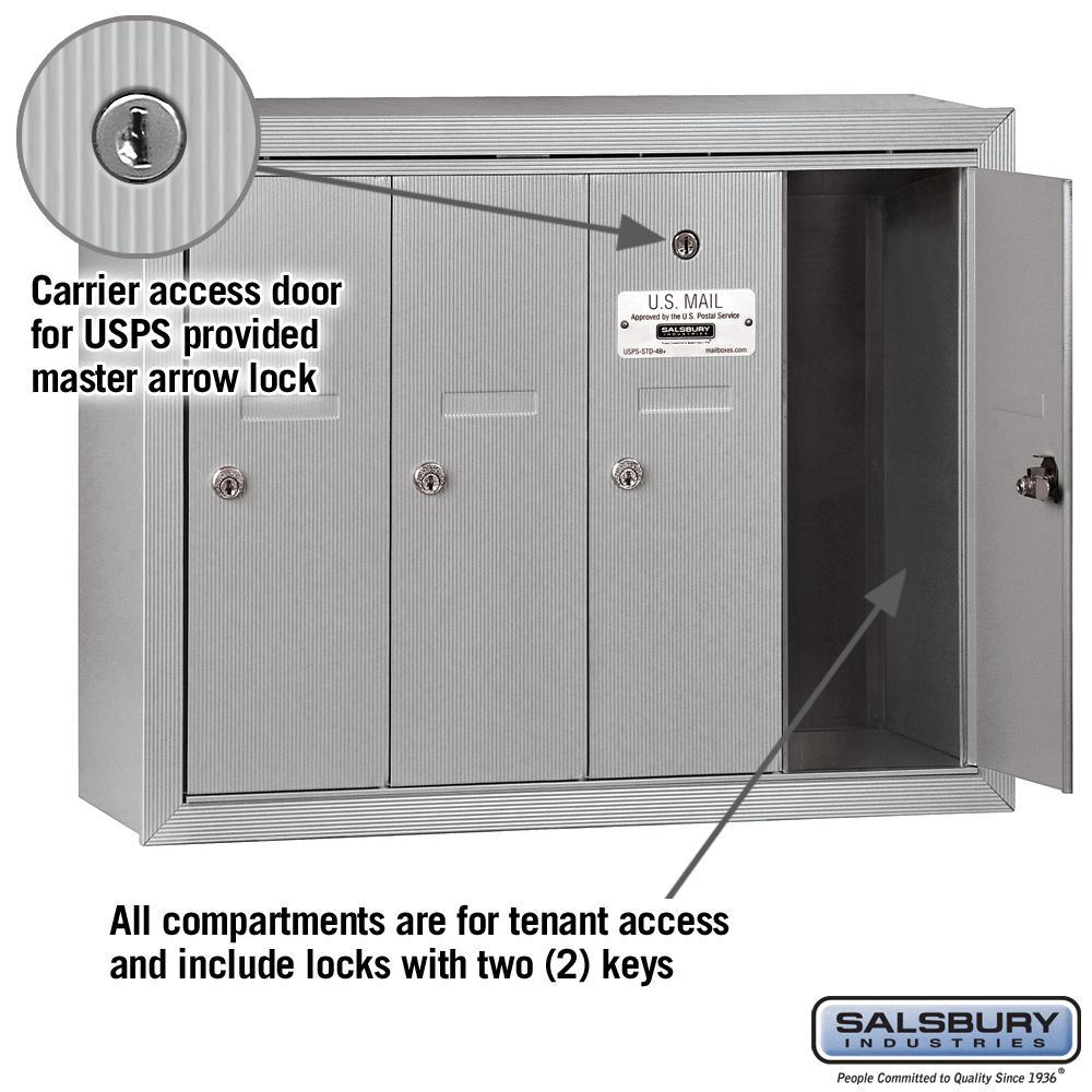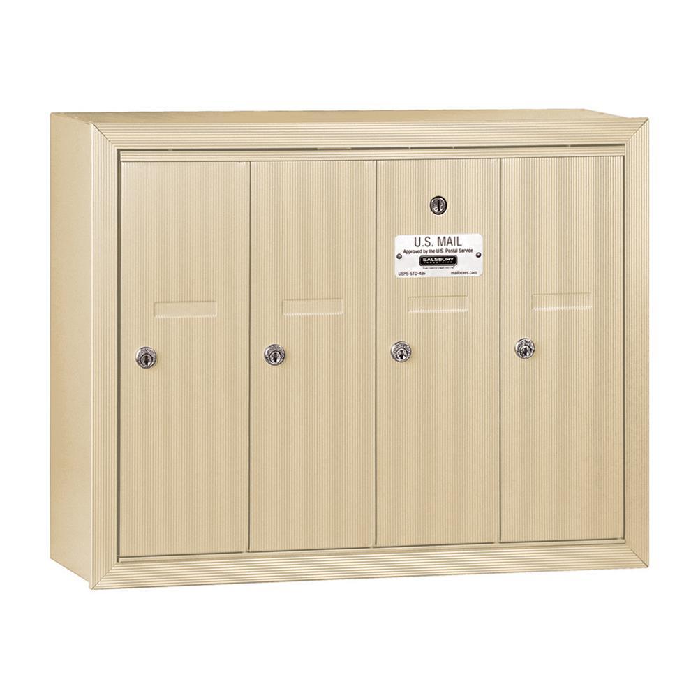 Made entirely of aluminum, Salsbury 3500 series USPS approved 4B plus vertical mailboxes feature a durable powder coated finish available in five (5) contemporary colors aluminum, brass, bronze, sandstone or green. Surface mounted units mount directly to a wall or other flat surface and are secured with mounting hardware through the back panel. Vertical mailboxes are approved for US Postal Service (USPS) mail delivery. Units feature 5-1/2 in. W x 16-1/4 in. H extruded aluminum doors. Each door includes a five (5) pin cylinder cam lock with two (2) keys and a 2-1/2 in. W x 5/8 in. H indentation to accommodate a label (included) identifying the tenant’s name and/or box number. Mailboxes are available in units with three (3) to seven (7) compartments. Each compartment is 16-1/4 in. H x 5-1/2 in. x 6-3/4 in. D.