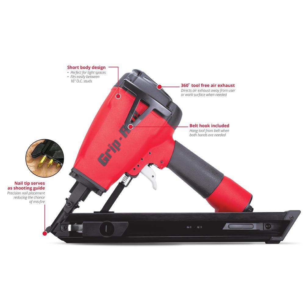 The GRSB150 is designed specifically for metal connector nails. The durable design of this precision metal connector nailer provides high-speed performance day after day. Applications include metal hangers, seismic and hurricane ties and anchor and connector straps. The GRSB150 has a lightweight, compact housing and is designed to easily fit between 12 in. O.C. joists. It features a fast and easy rear loading design and a 360° tool-free air exhaust. This tool drives 1-1/2 in. 30 to 34 paper collated nails with a shank diameter from 0.131 in. to 0.148 in. thickness. Grip-Rite stands behind all their pneumatic tools with the RED Promise an industry leading warranty and service program that includes a 7-Year warranty on tools and a nationwide service network. Also included with the purchase of this tool: Carrying Case and Owner's Manual, Belt hook, Safety Glasses, All Required Hex Wrenches, Tool Oil and a Male Air Plug.
