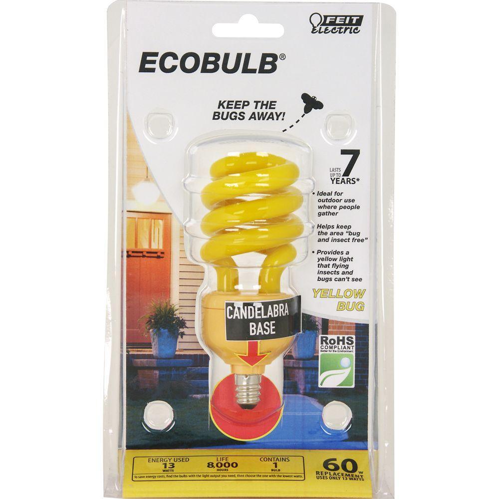 Consider using the Feit Electric 60-Watt Equivalent Spiral Yellow Bug Light Bulb on your patio or for your next party. This light bulb casts a yellow glow to help keep pesky bugs and insects away. This long-lasting bulb shines for up to 8,000-hours using 13-Watt of energy.