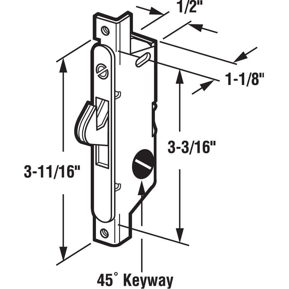 This is a stainless steel mortise lock for a 45° keyway. The hook is spring loaded with an adjustable hook projection that extends to the locked position to automatically latch upon closing. Has a round end faceplate that is designed to fit on Adam Rite doors.