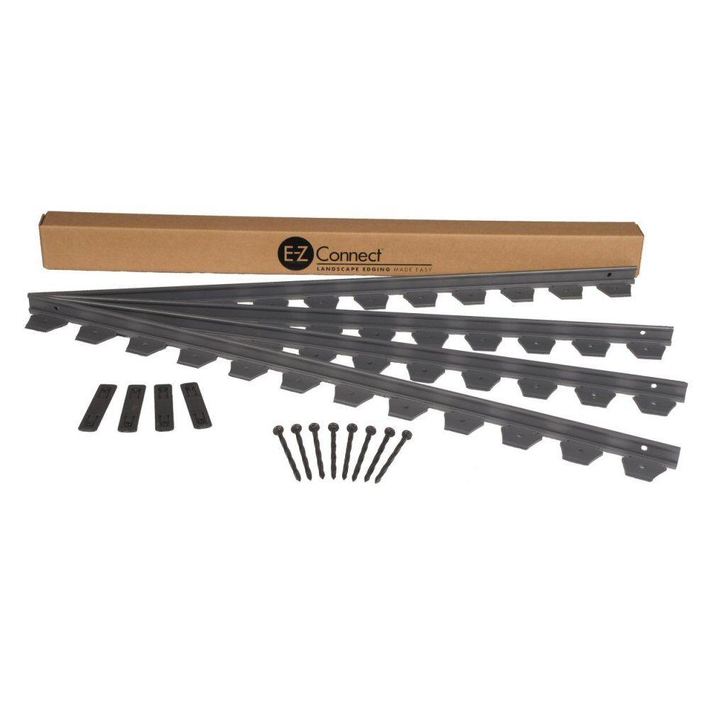 Engineered to provide lasting support for brick or stone walkway and patio projects. E-Z Connect Multipurpose 24 ft.Paver Edging will hold your hardscape project in place. The low profile design curves easily without additional snipping or cutting. Locking connectors allow edging pieces to snap together for a virtually seamless connection. Unique spiral spikes are driven through predrilled holes in horizontal support tabs to help prevent movement after installation. Also works great as a landscape edging. Manufactured from 100 percent recycled plastic materials. Each kit includes everything needed for a standard 24 ft. Installation: four 6 ft. Lengths of edging, four locking connectors and (16) 8 in. Spiral spikes. All components are black in color.*Size and weight are approximate
