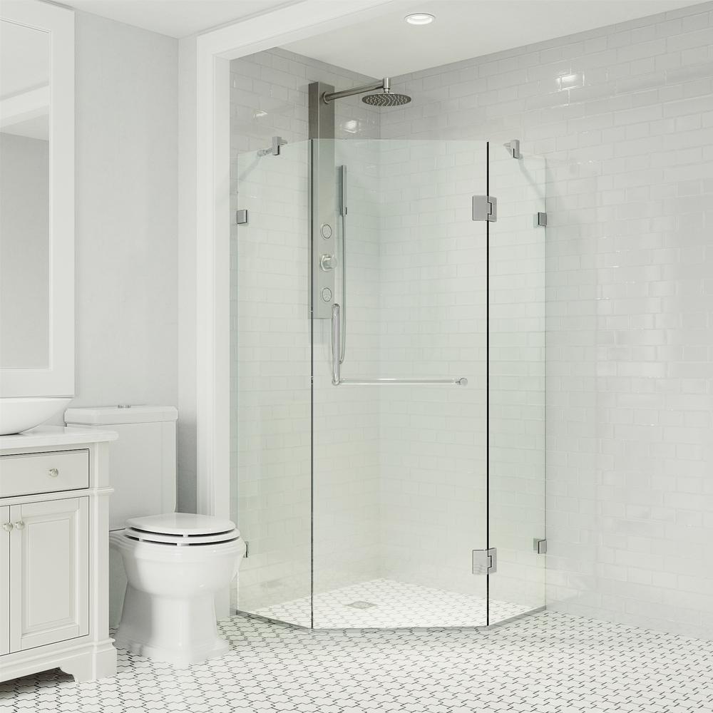 Maximize your bathroom space with the VIGO Piedmont Frameless Neo-Angle Hinged Door Shower Enclosure. Stainless steel construction and 3/8" tempered glass makes this shower enclosure durable for everyday use. Its central entry makes for a unique feature unlike most other shower enclosures. With the option to install the door with a left or right side opening, the Piedmont Frameless Neo-Angle Hinged Shower Enclosure is truly one of a kind.