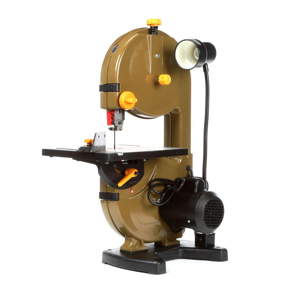 Lightweight and easy to transport the Rockwell 9 in. Band Saw with Work Light is a powerful bench-top band saw with a 2.5 Amp motor and a large 11-13/16 in. sq. ribbed aluminum table. With a table-tilting adjustment ranging from 0° to 45° for bevel cuts and a blade guide adjustment for custom depth settings, the saw is extremely versatile. It includes a work light for illuminating the cutting area.