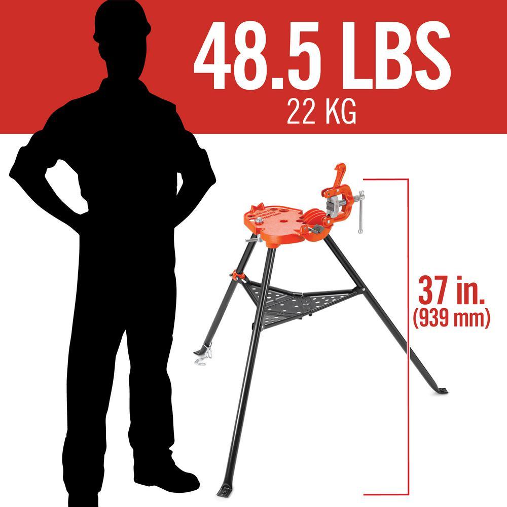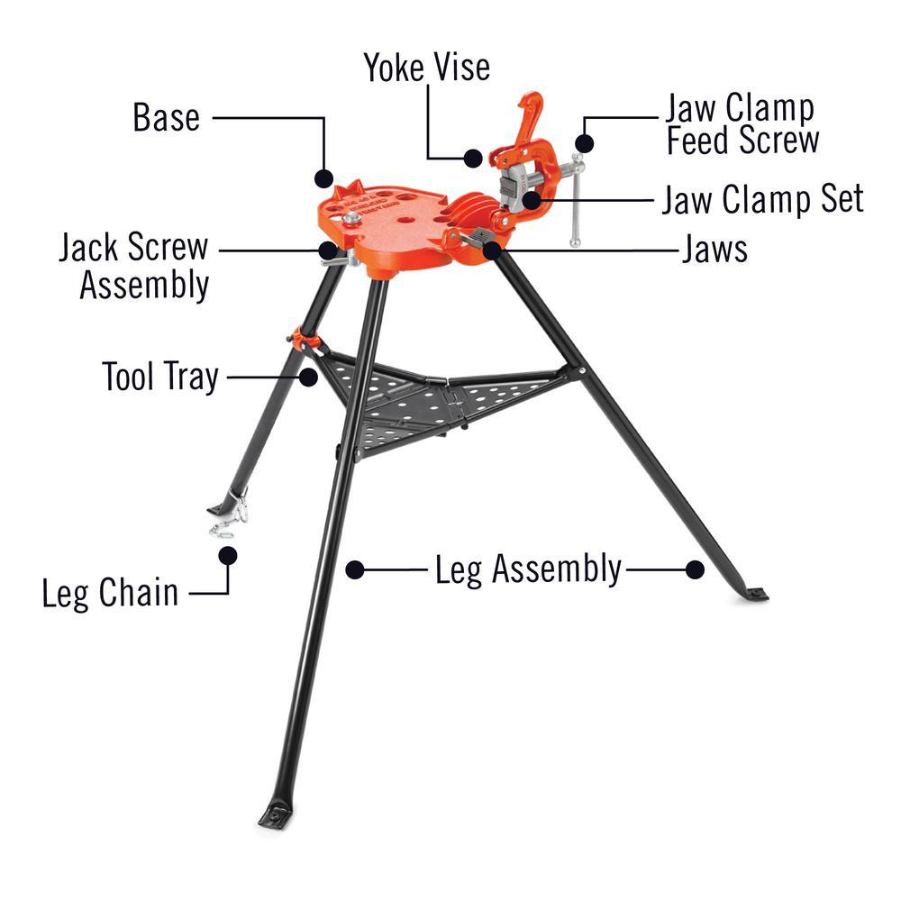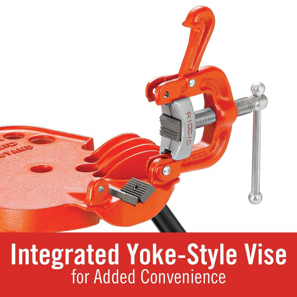Built for tough jobsite use, the RIDGID 40A TRISTAND Kit Yoke Vise securely holds pipe in place for threading or cutting. The pipe vise integrates a yoke-style vise into the base along with a handy rugged tool tray. Designed for easy transport and set-up, it features integral legs and tray that fold in. Built for ease of use, the large TRISTAND vise base overhangs the front legs for a clear tool swing. The pipe vise stand comes complete with a handy pipe rest, 3 pipe benders and slots for hanging tools. This RIDGID pipe vise has a 1/8 in. to 2-1/2 in. pipe capacity.