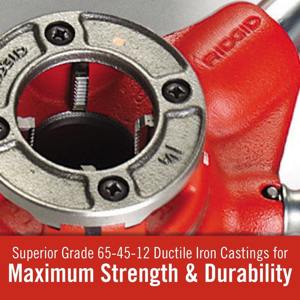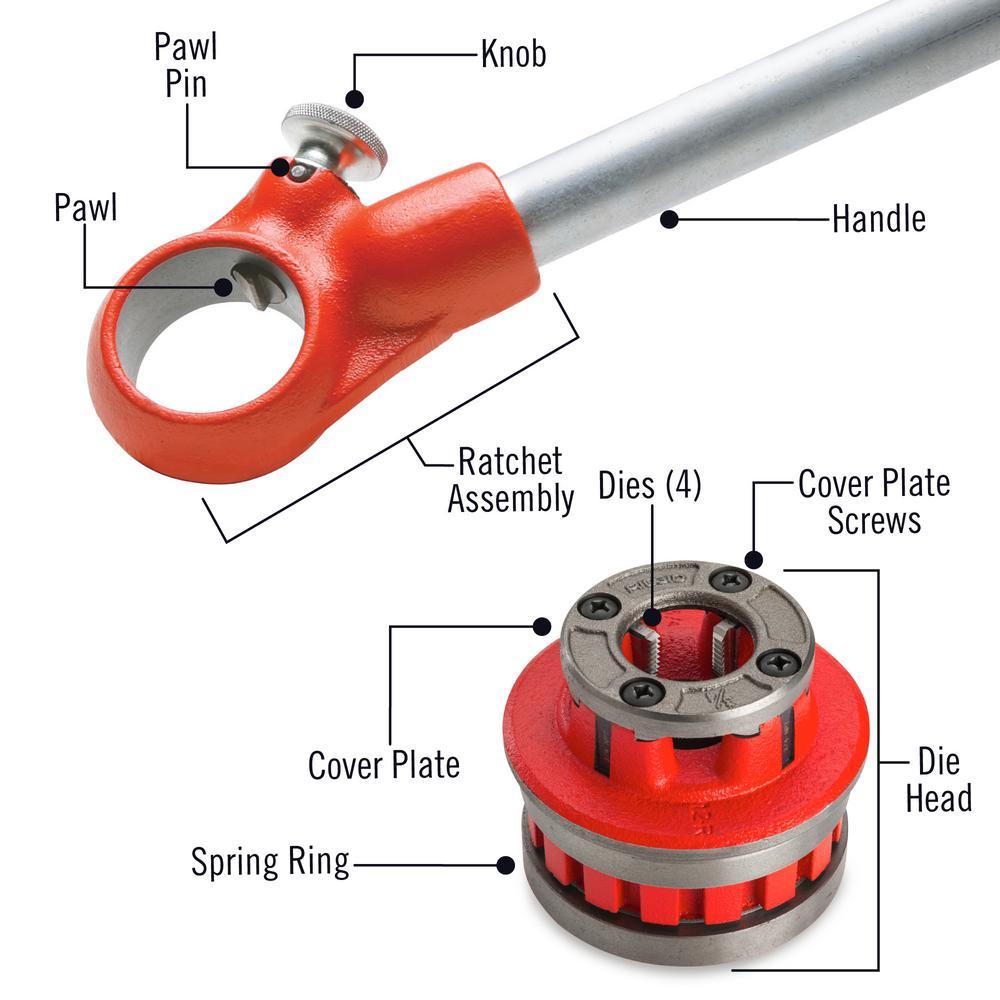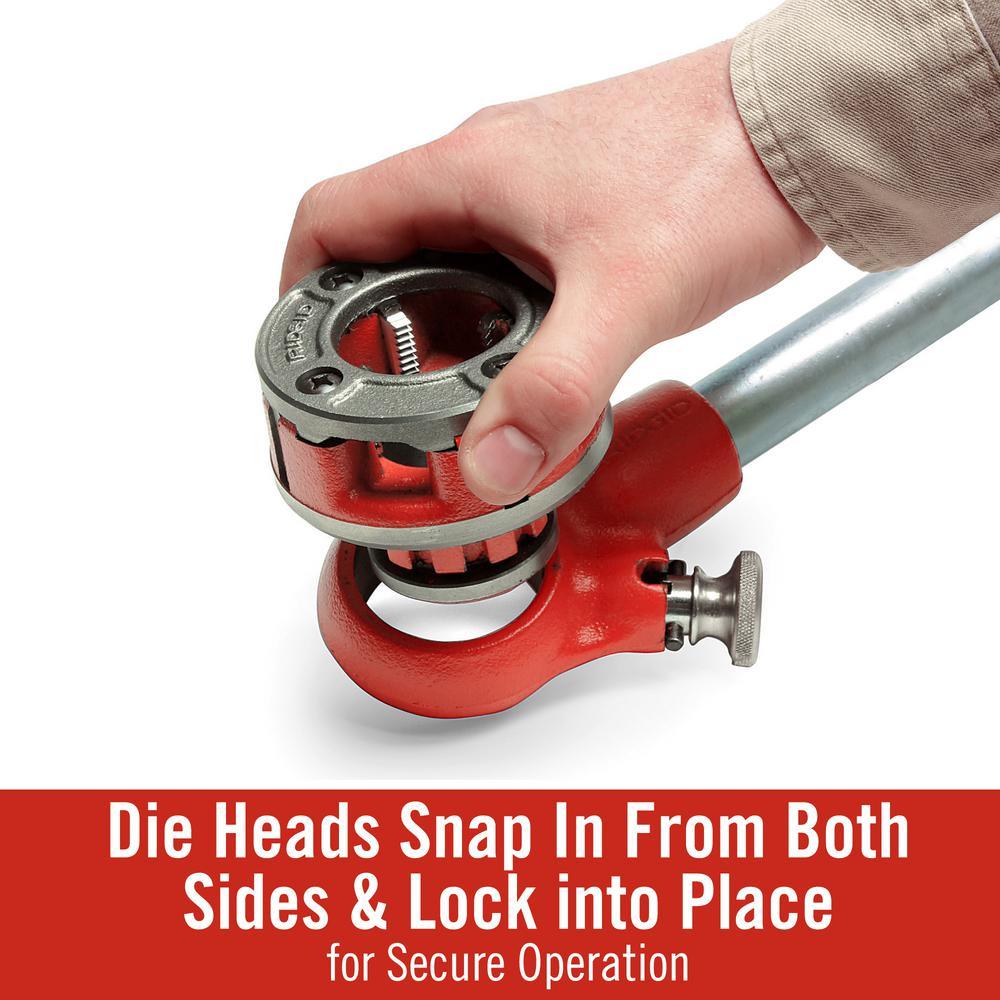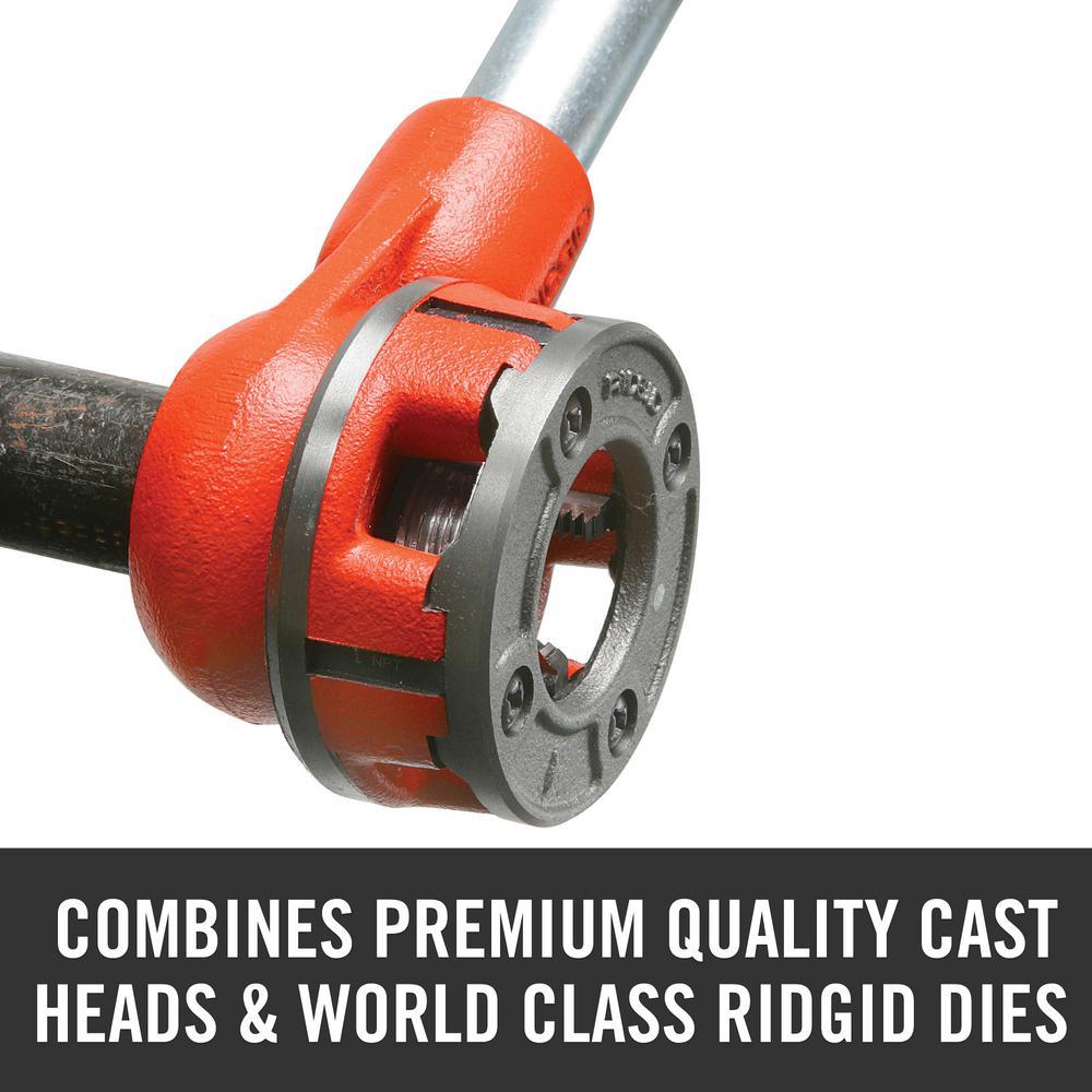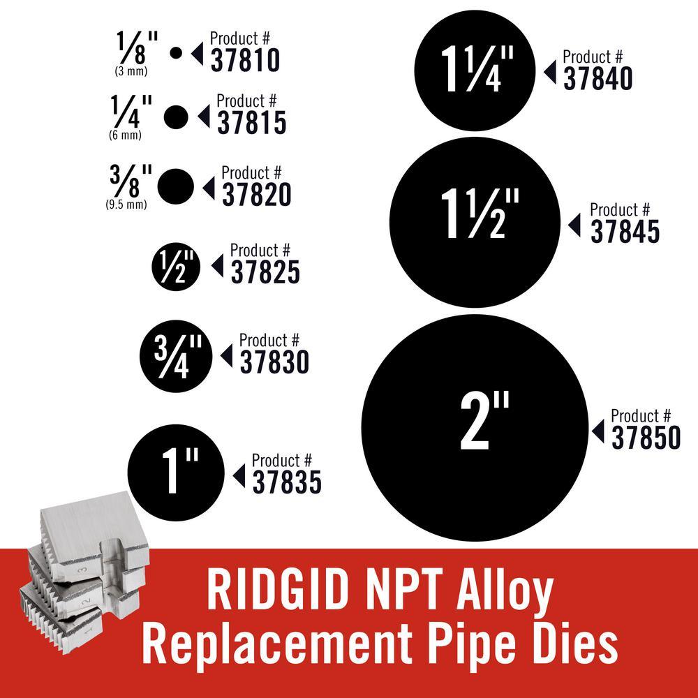 - NPT die heads 1/8 in., 1/4 in., 3/8 in., 1/2 in., 3/4 in., 1 in., 1-1/4 in., 1-1/2 in. and 2 in.