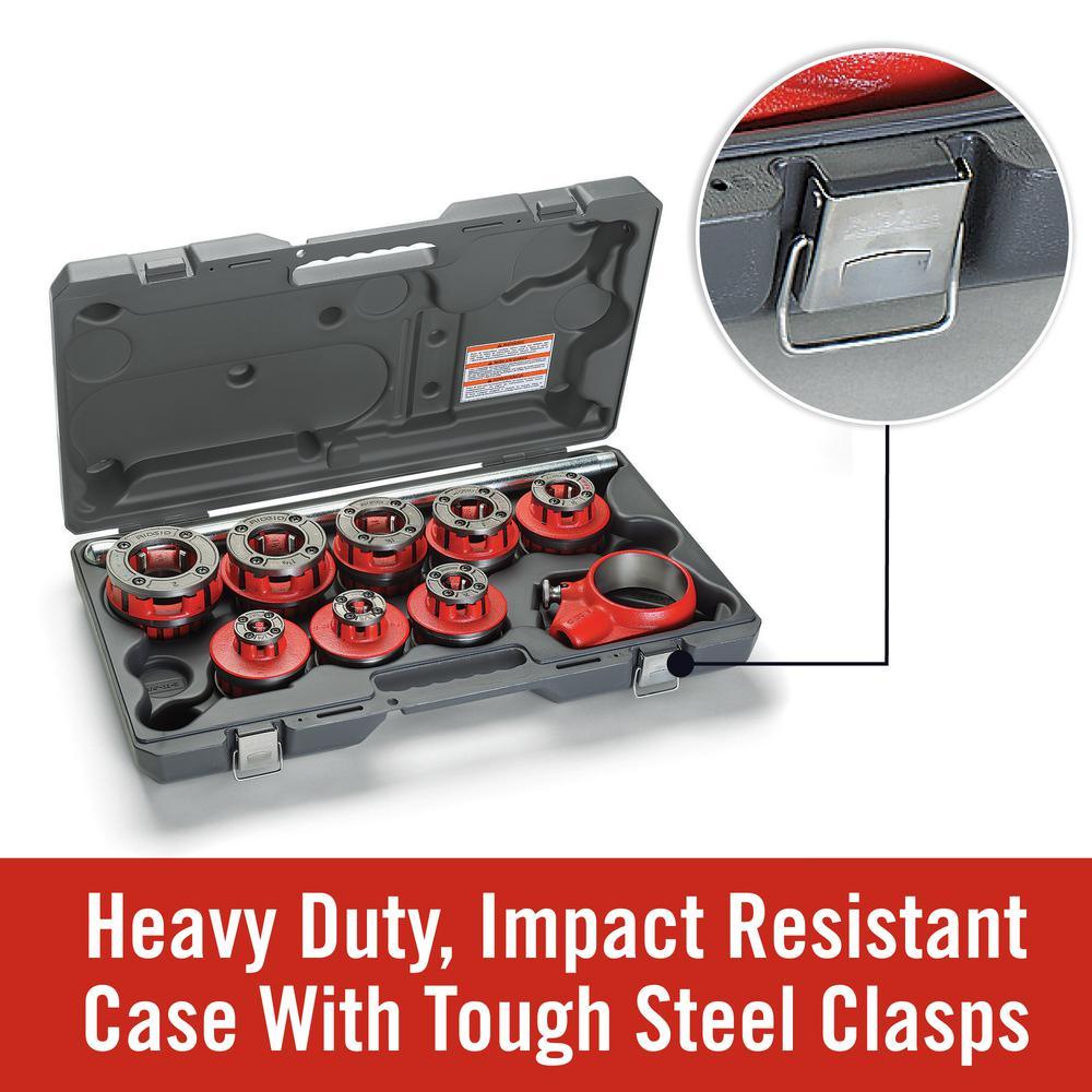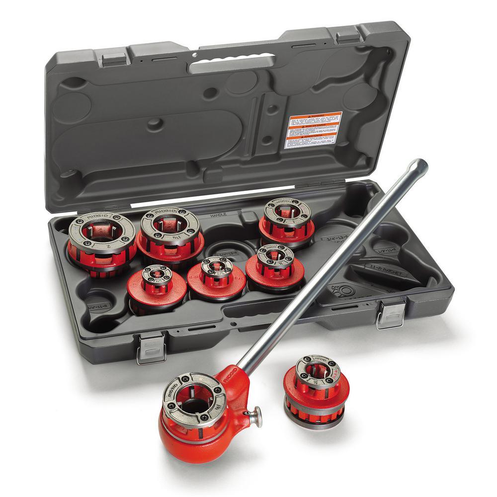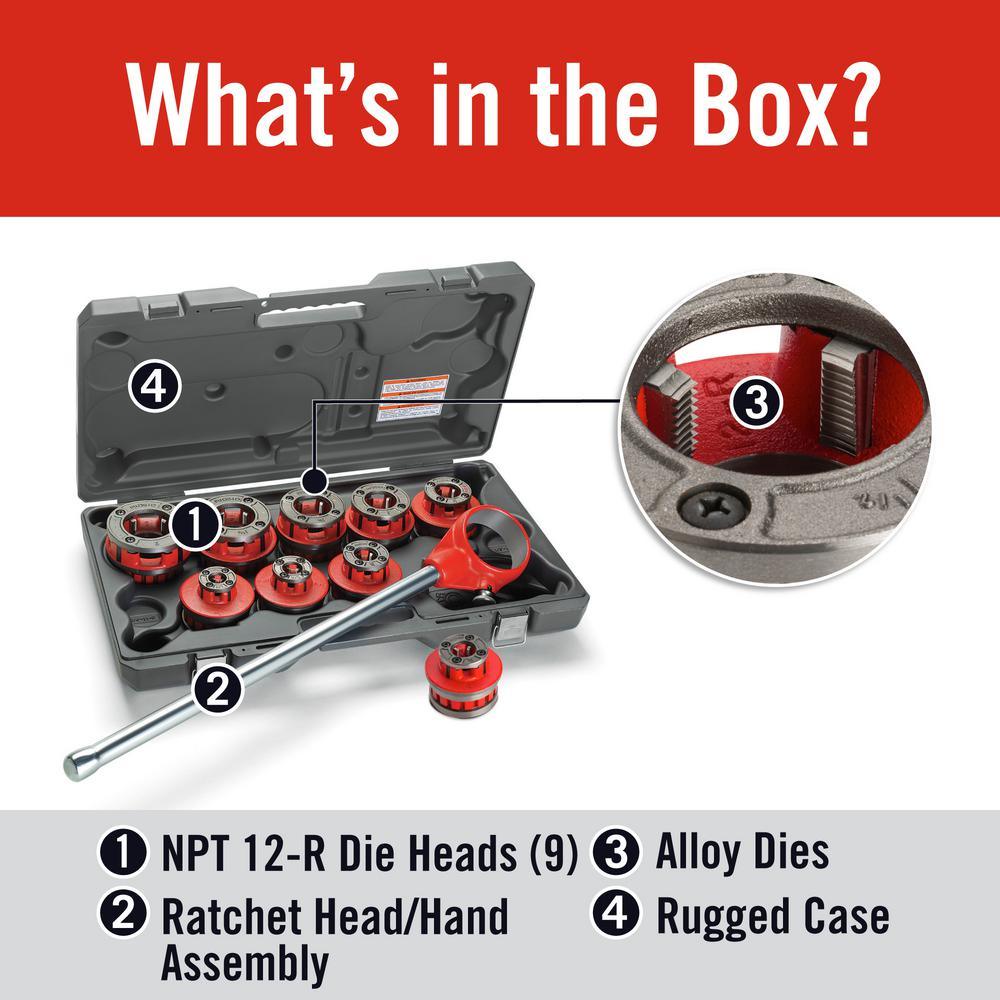 The RIDGID 12-R Exposed Ratchet Threader Sets are designed to thread pipe. It was also designed as conduit using individual die heads for each size of pipe and a manually operated ratchet. The 12-R Exposed Ratchet Threader Set includes Ratchet Assembly and Ratchet Handle, alloy NPT model 12-R Die Heads for 1/8 in., 1/4 in., 3/8 in., 1/2 in., 3/4 in., 1 in., 1-1/4 in., 1-1/2 in. and 2 in. steel pipe and plastic carrying case. The set weighs 45-1/2 lbs.
