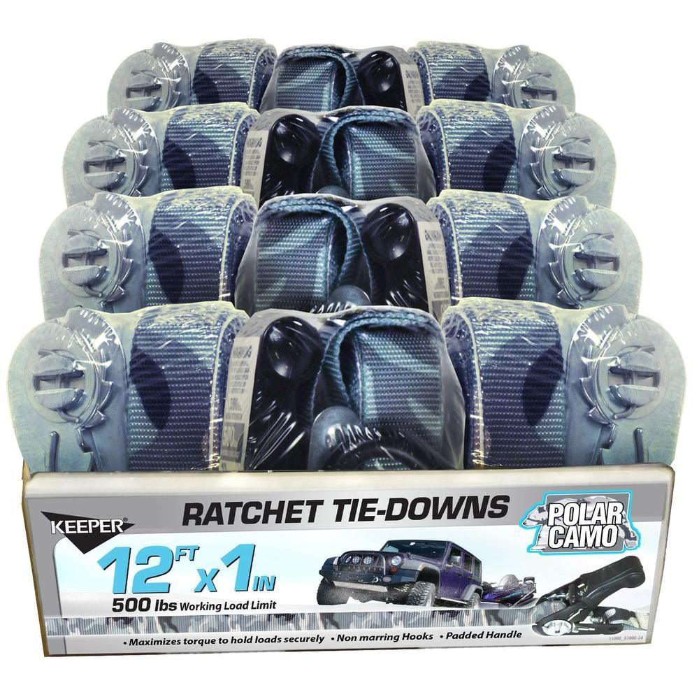 Keeper's 1 in. x 12 ft. x 500 lbs. Polar Camo Ratchet is perfect for winter activities. The 500 lbs working load limit nylon webbing is 12 ft. in length, abrasion resistant, and will not rot or mildew. It comes with a padded handle ratchet for added comfort.