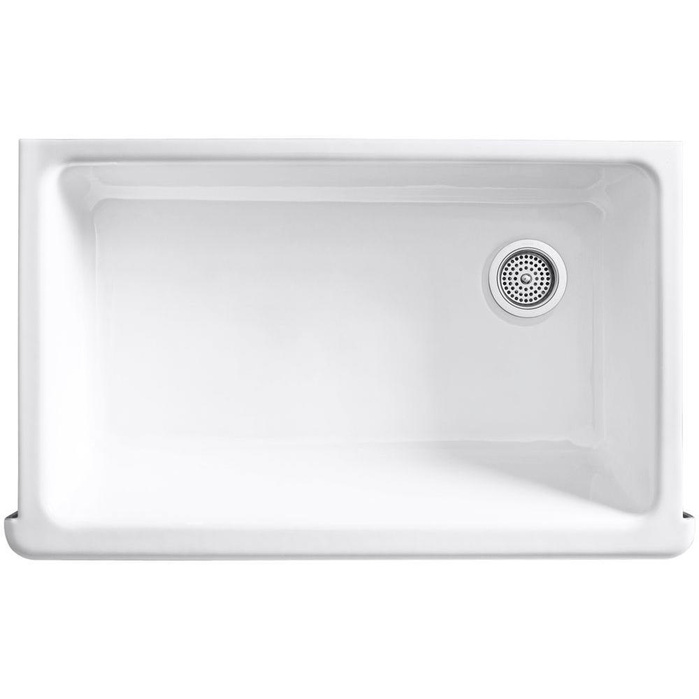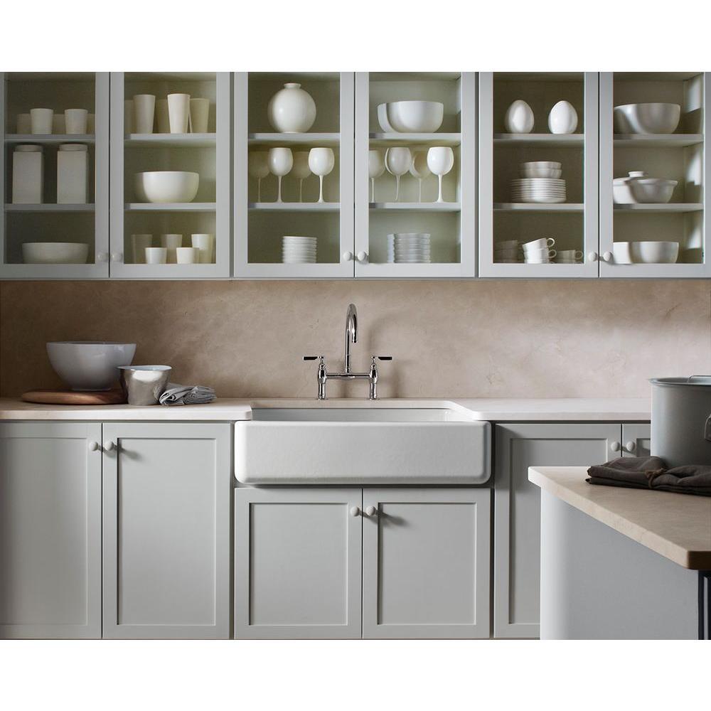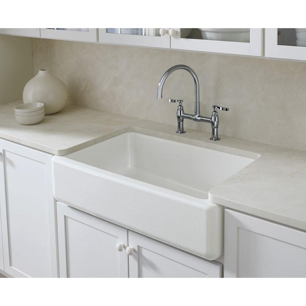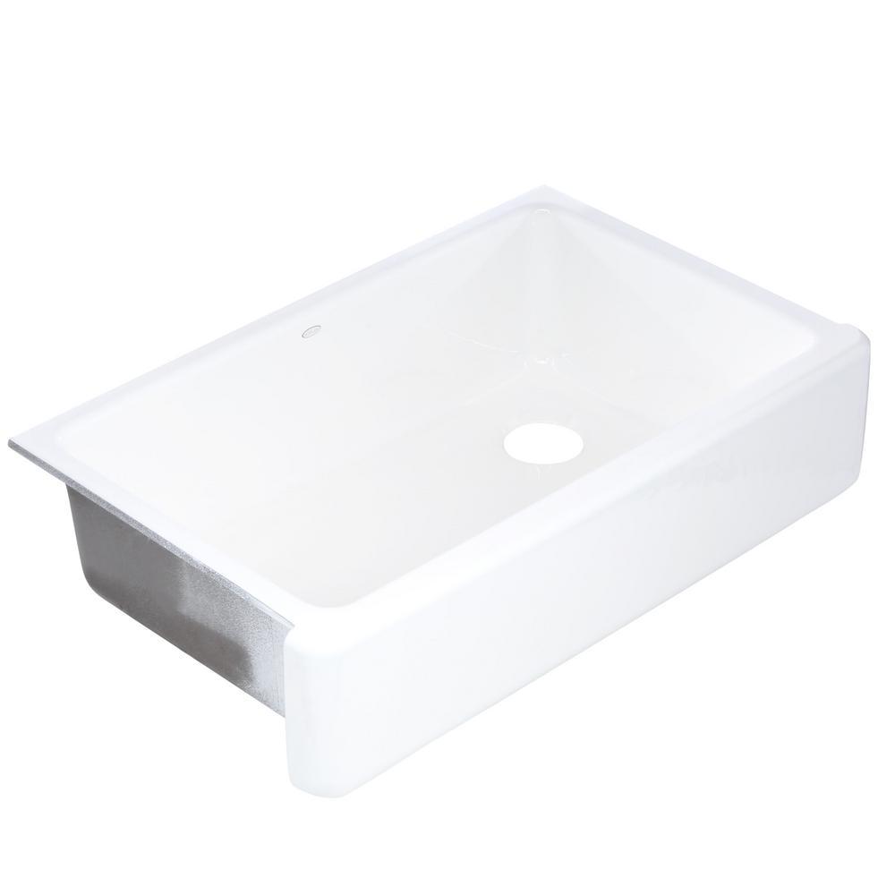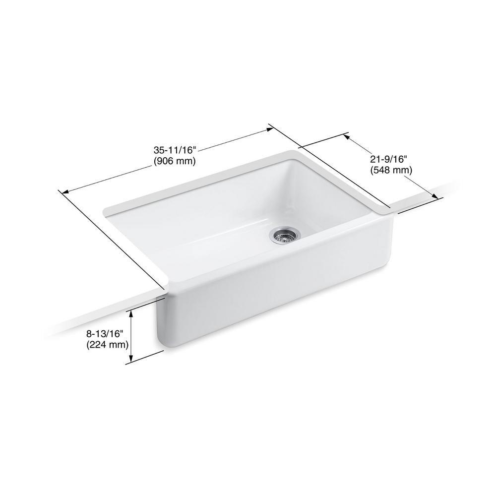 The Whitehaven apron-front kitchen sink features a streamlined and versatile farmhouse style to complement any decor. A large single basin accommodates large pots and pans, while the sloped bottom helps with draining and cleanup. Crafted from enameled cast iron, this sink resists chipping, cracking, or burning for years of beauty and reliable performance. A standard apron front makes it easy to install on 36 in. apron-front cabinetry. The Self-Trimming design requires only a simple rough cut, overlapping the cabinet face for beautiful results.