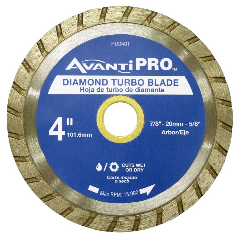 The AvantiPRO 4 in. Turbo Diamond Blade provides the best cutting performance and long life for all of your DIY projects. Use the turbo rim blade for fast and smooth cuts on concrete, brick, block, stone, and stucco. This blade will fit most small angle grinders.