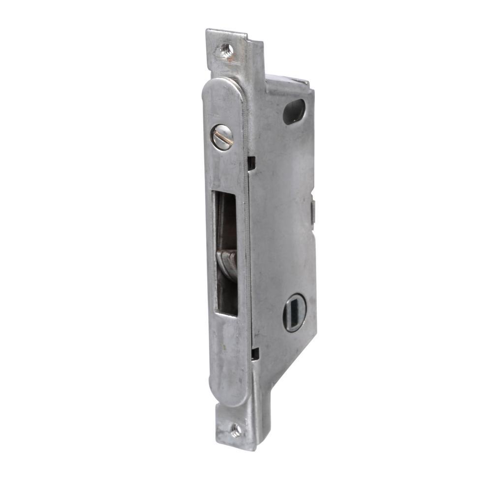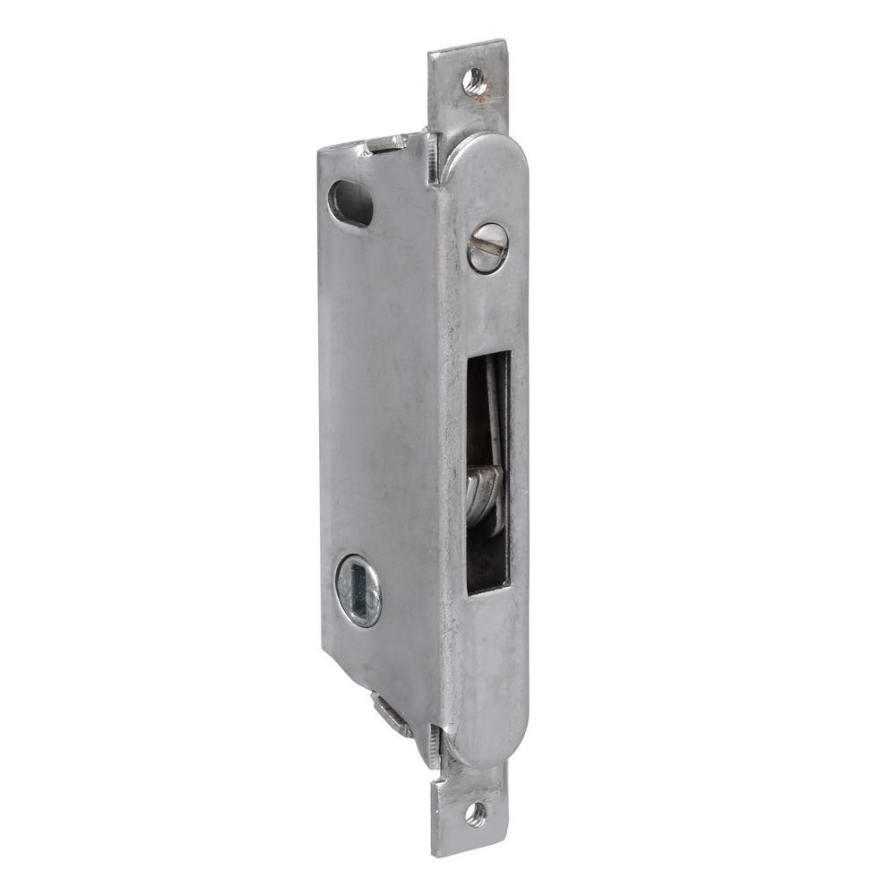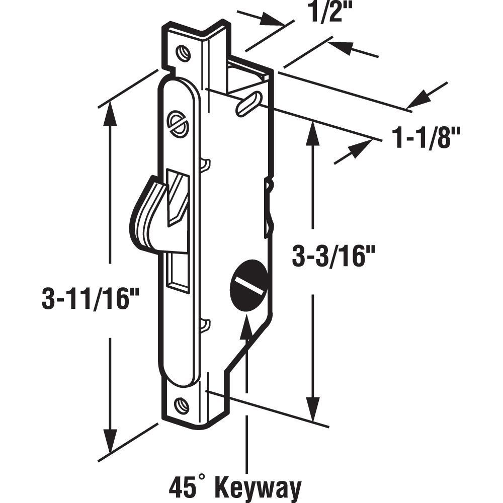This sliding door lock is constructed from stainless steel. It features a steel hook with adjustable projection. This lock fits on Adams Rite sliding glass doors. It features a round end faceplate, and the keyway is in the 45 degree position with hook fully extended.