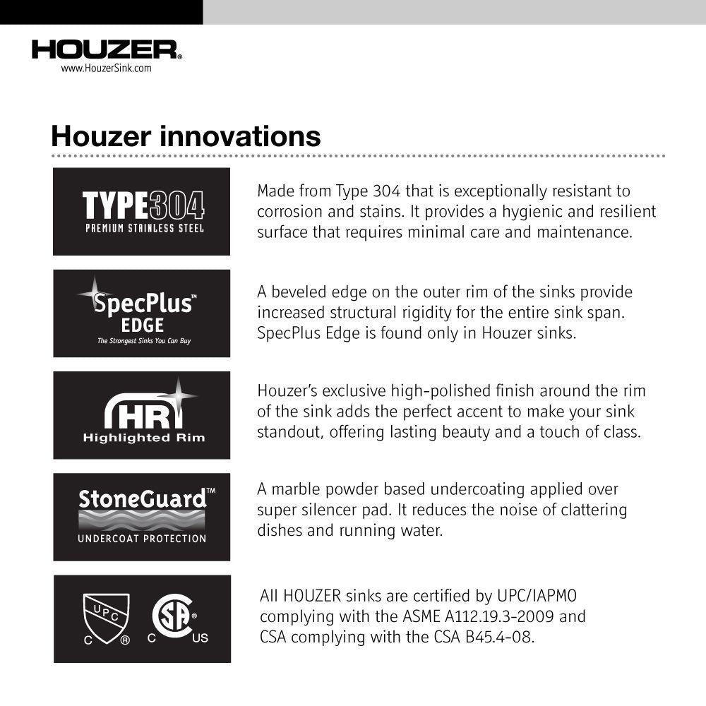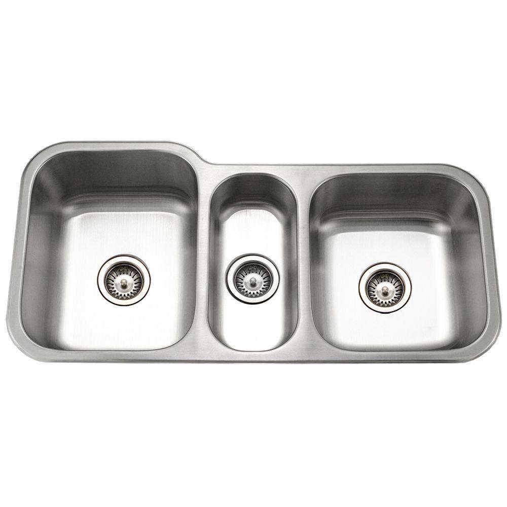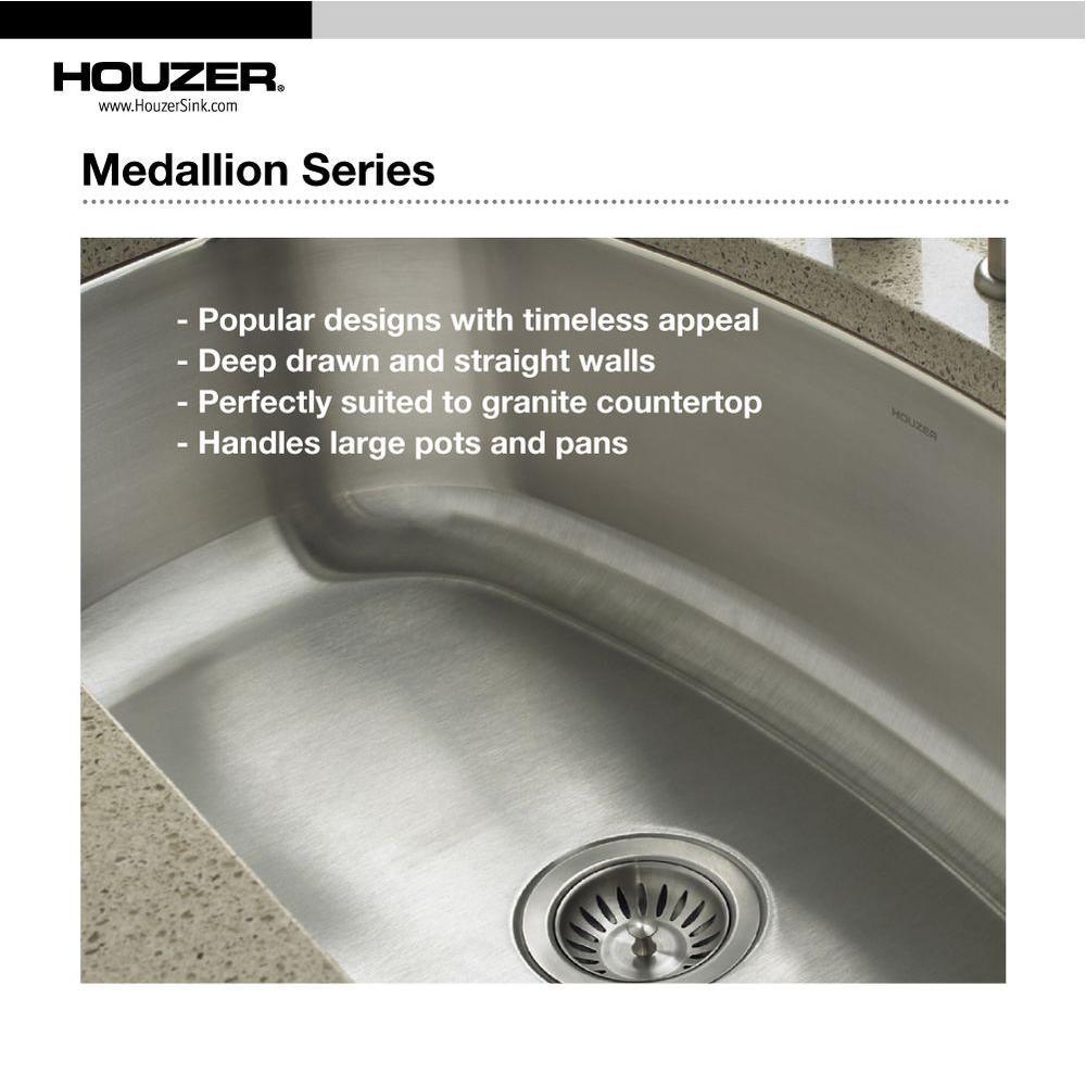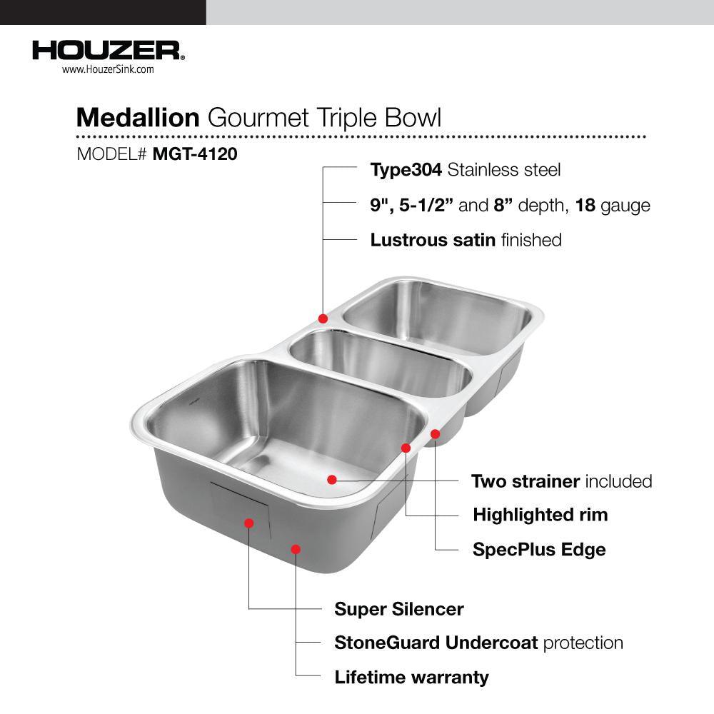 This HOUZER Medallion Gourmet Series Triple Bowl Undermount sink accommodates extreme multi-tasking with three different sized bowls elegantly clustered and designed in an offset silhouette. Exquisitely brushed for a refined look and highlighted with a polished rim for added sparkle. Bowls are arranged in 9 in., 5.5 in. and 8 in. D, with the smaller prep bowl conveniently in the middle. StoneGuard undercoating over Super Silencer rubber pads creates a quiet workspace, free from the clatter of dishes while retaining the heat in your hot water soak. Includes 2 strainers.