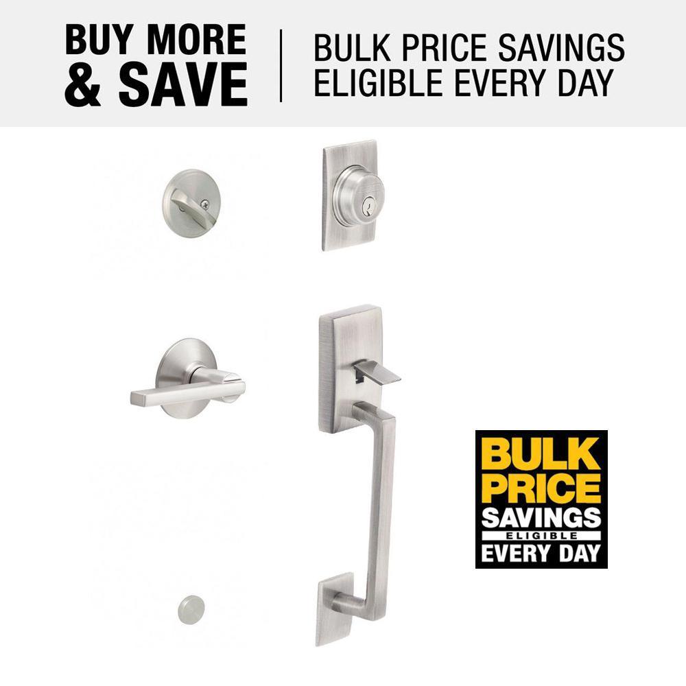 The Schlage Century Single Cylinder Satin Nickel Handle set with Latitude Lever is perfect for use on exterior front doors. The Latitude lever offers a crisp perspective on minimalist design with its clean lines and rectangular features. The Century Trim is chic with a delicate, slightly curved shape especially when wrapped in our versatile Satin Nickel finish. Plus, its been designed and tested with strength and durability in mind.