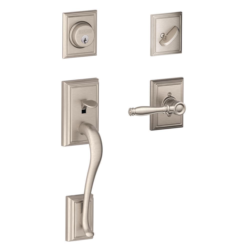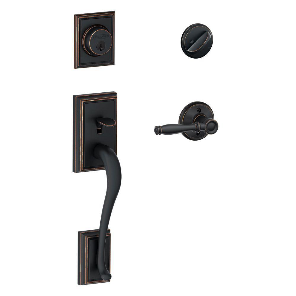 The Schlage Addison Aged Bronze Single Cylinder Deadbolt with Birmingham Lever Door Handleset is perfect for use on exterior front doors. The ornately styled Birmingham lever spares no attention to detail, providing a touch of refinement everywhere it goes, while the Addison handleset’s distinguished look incorporates subtle details without losing its classic simplicity. Our Aged Bronze finish is inspired by traditional design, featuring warm, copper tones that break through its darker, aged exterior. Plus, it’s been designed and tested with strength and durability in mind.