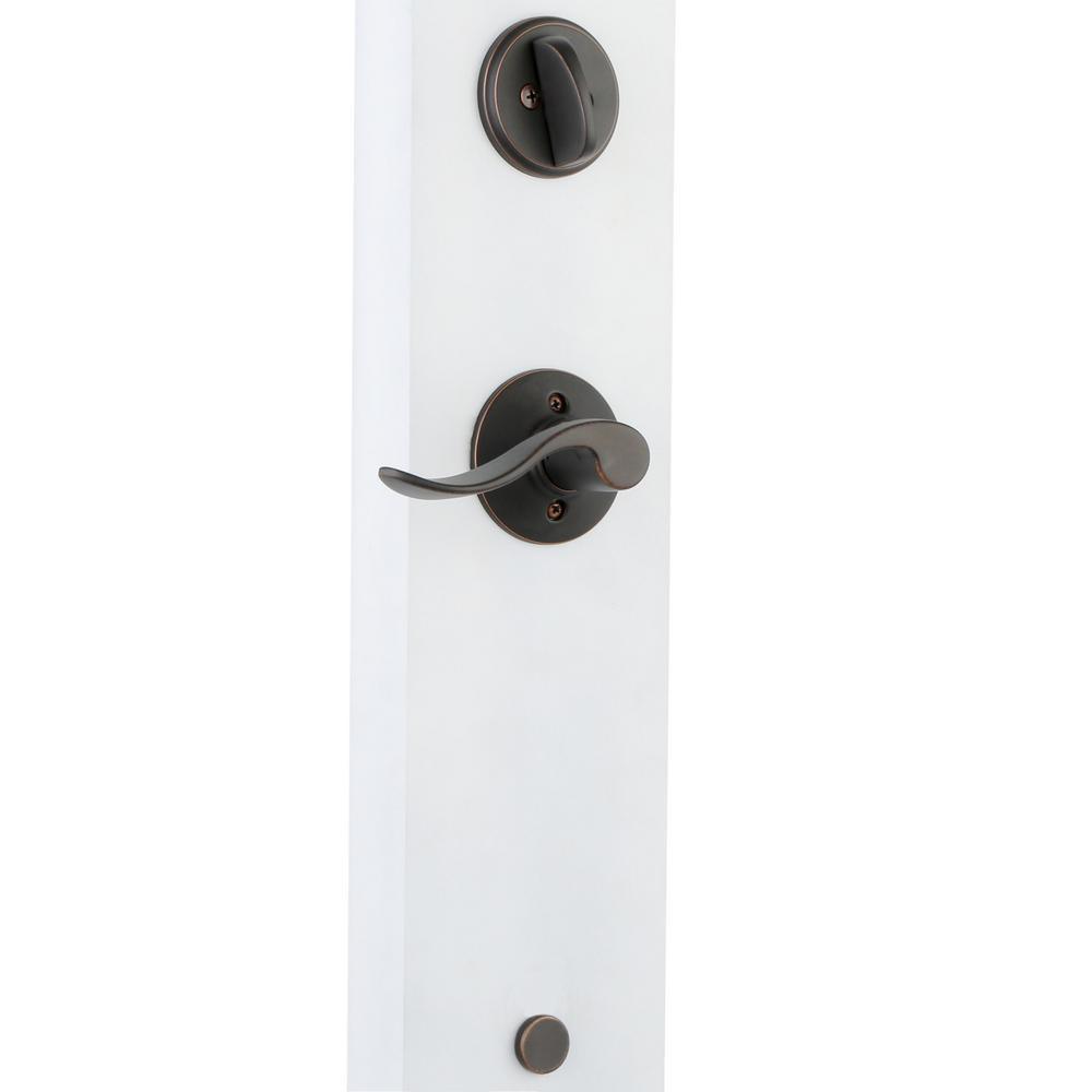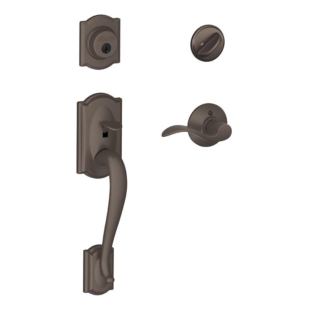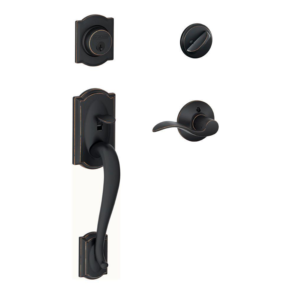 The Schlage Camelot Aged Bronze Single Cylinder Deadbolt with Accent Lever Door Handleset is perfect for use on exterior front doors. The Accent Lever is widely popular for its elegant wave-like design that effortlessly matches a room's style without overshadowing it, while the Camelot handleset's scalloped architectural details make any room charming and approachable. Our Aged Bronze finish is inspired by traditional design, featuring warm, copper tones that break through its darker, aged exterior. Plus, it's been designed and tested with strength and durability in mind.